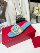 Vlogo embellished leather-trimmed raffia slides baby blue