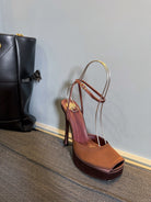LA SCANDALE PLATFORM SANDALS IN DARK CAPPUCCINO SATIN