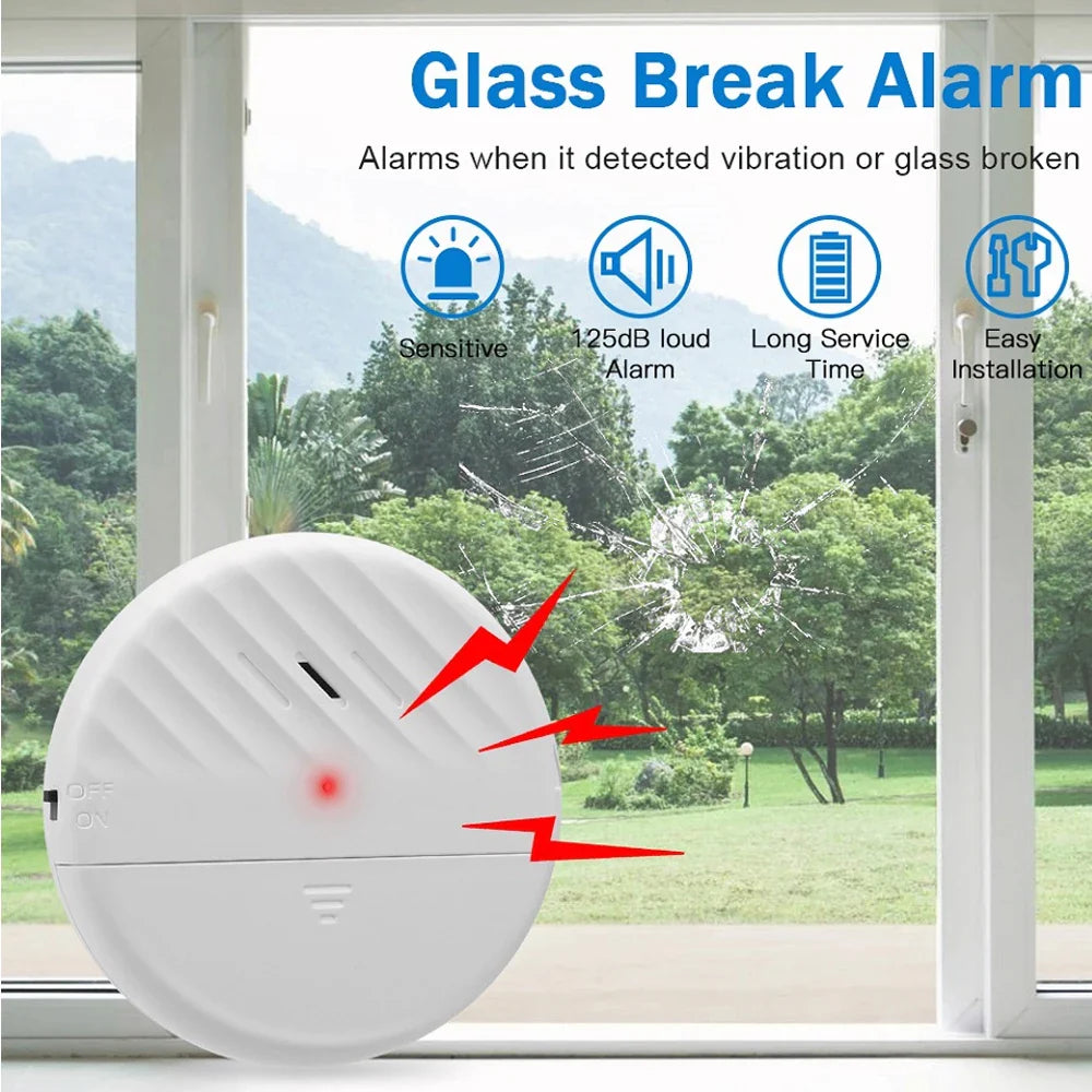 The 125dB Wireless Glass Break Alarm is designed to enhance home security by detecting vibrations and sounding a loud alarm. With adjustable sensitivity and easy installation, this anti-theft device is ideal for windows, doors, and glass surfaces.