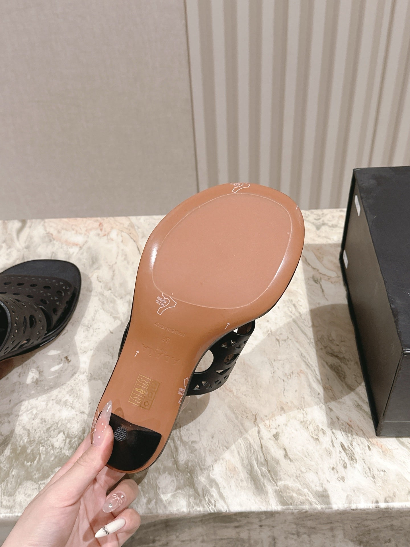 Alaia 2025 Vienne Cutout Kitten-Heel Slide Sandals Black Leather 293648