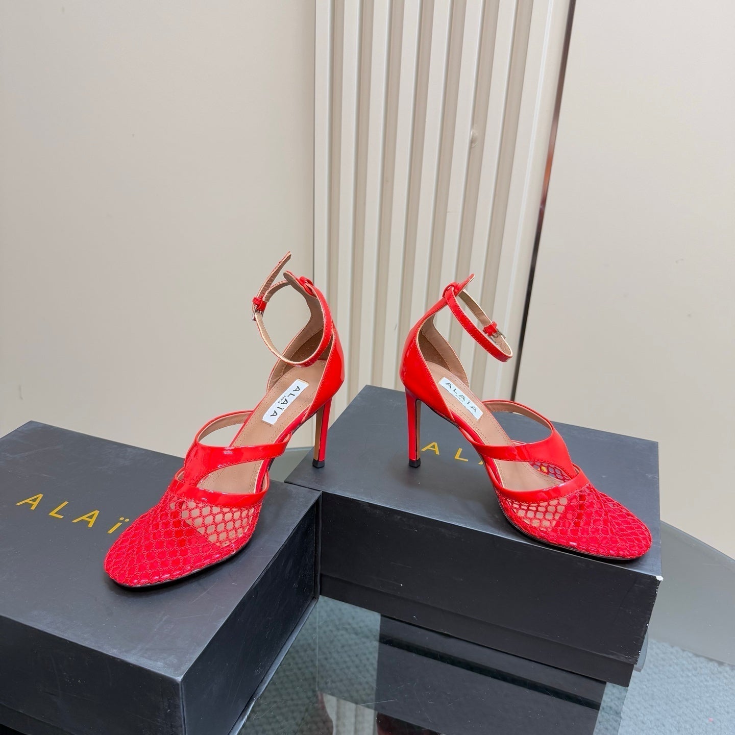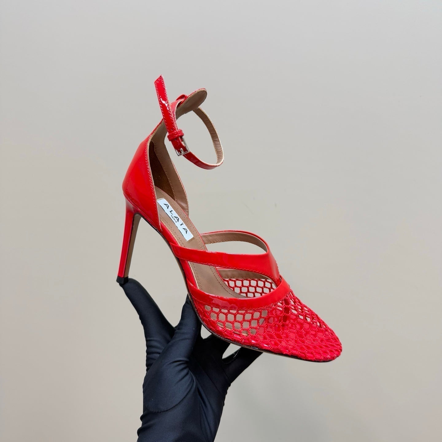 Alaia Fishnet Thong Heels Sandals Red Lambskin 299660