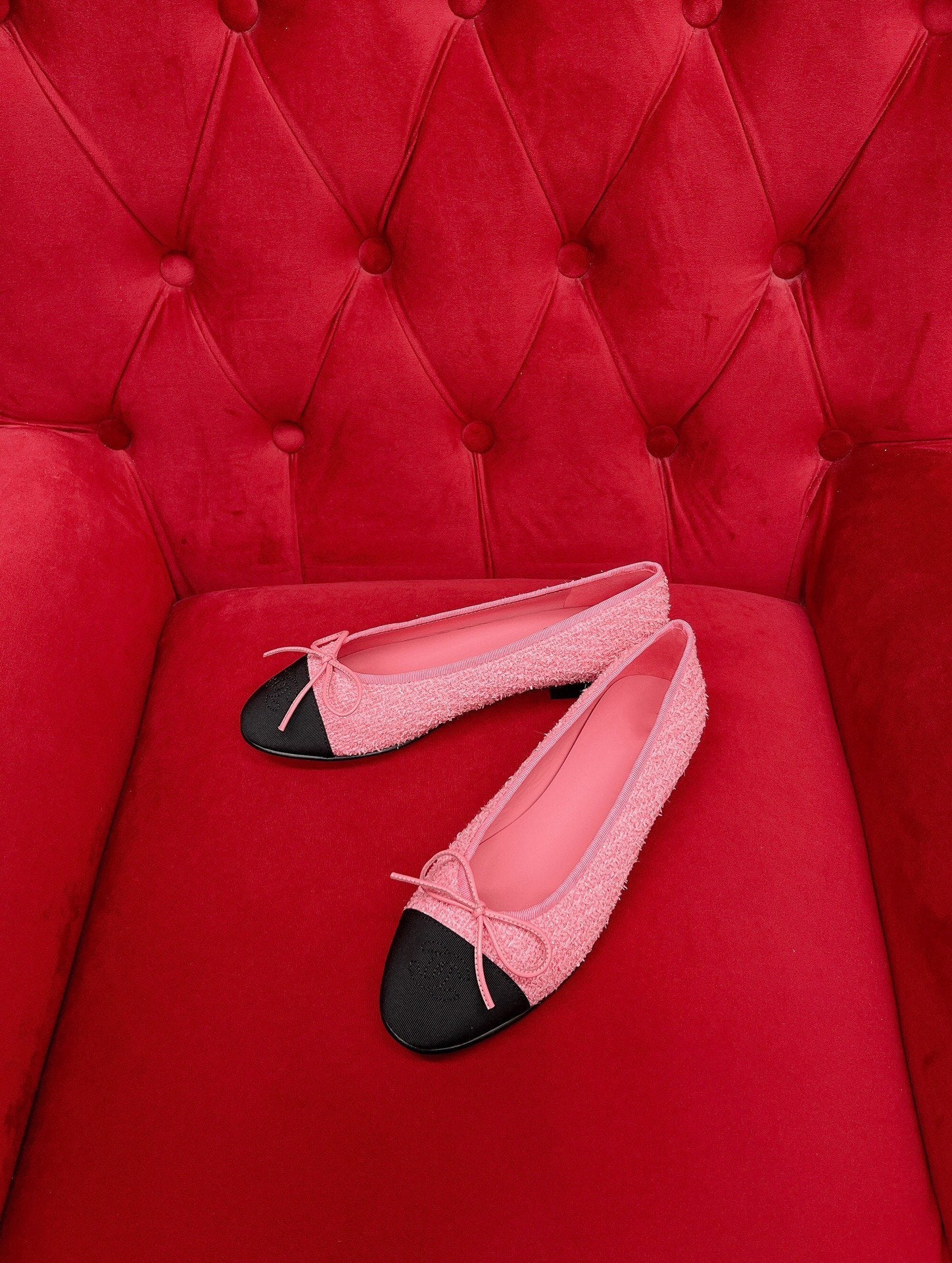ballet flat pink black tweed grosgrain
