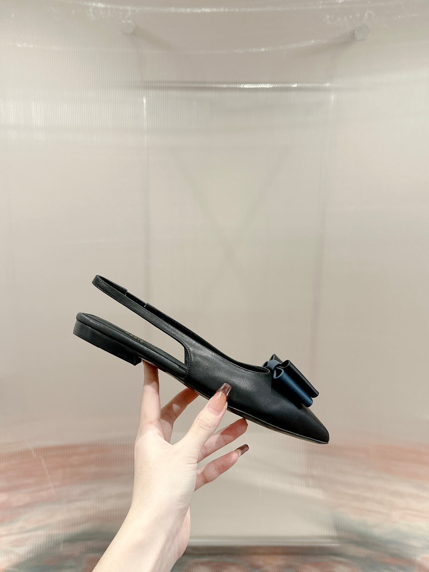CASSANDRA SLINGBACK FLAT IN BLACK MIX BLUE SMOOTH LAMBSKIN