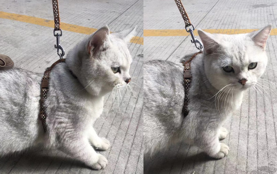Ajoutez une touche de glamour à l'attirail de votre chat avec notre Collier Harnais Réglable STING en nylon marron à pois. Conçu avec amour et précision, ce harnais révolutionnaire est la solution idéale pour une promenade sécurisée et confortable.