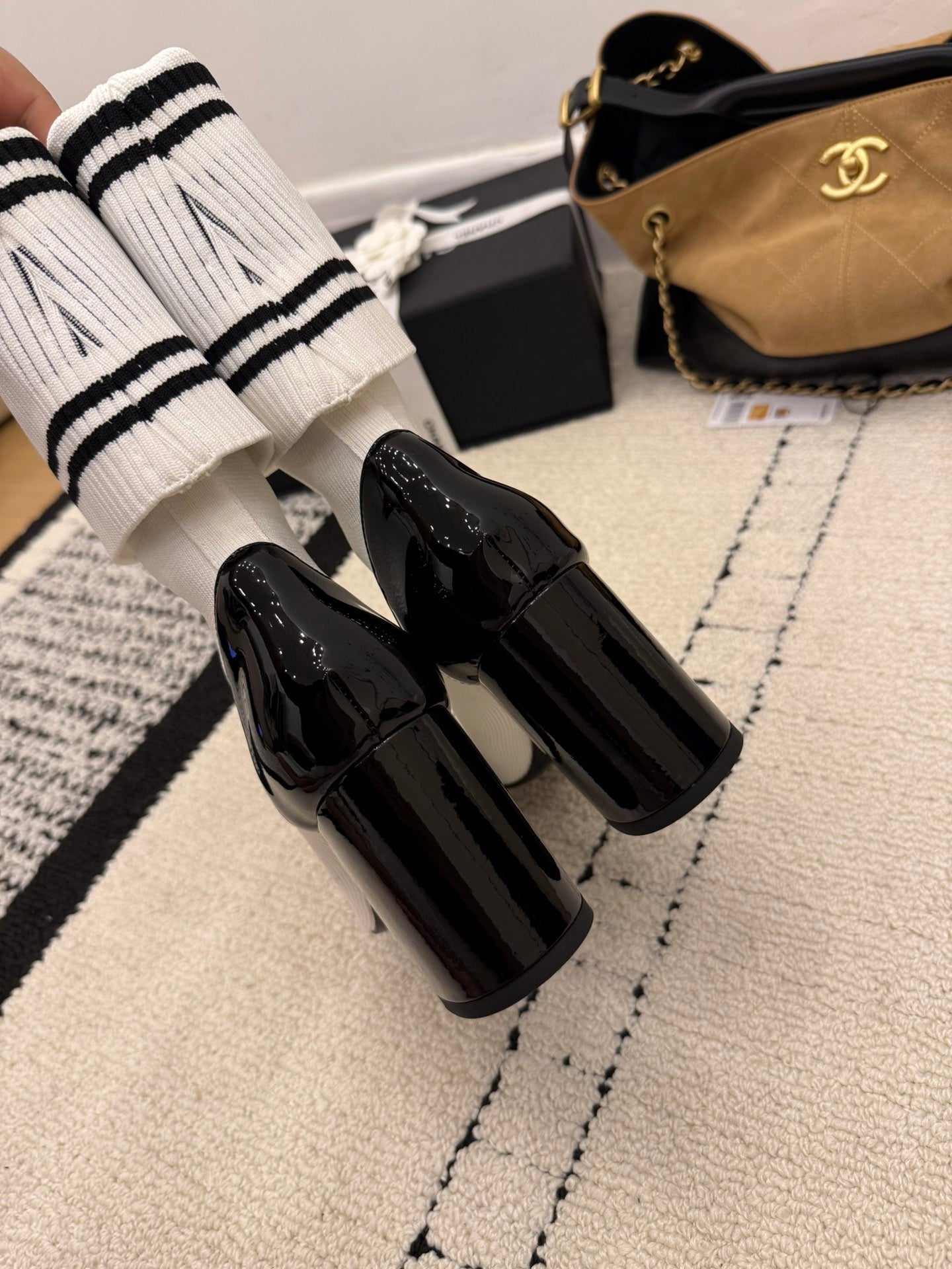 CC 2025 Chunky Heel Sock Boot White Leather Knit 548118