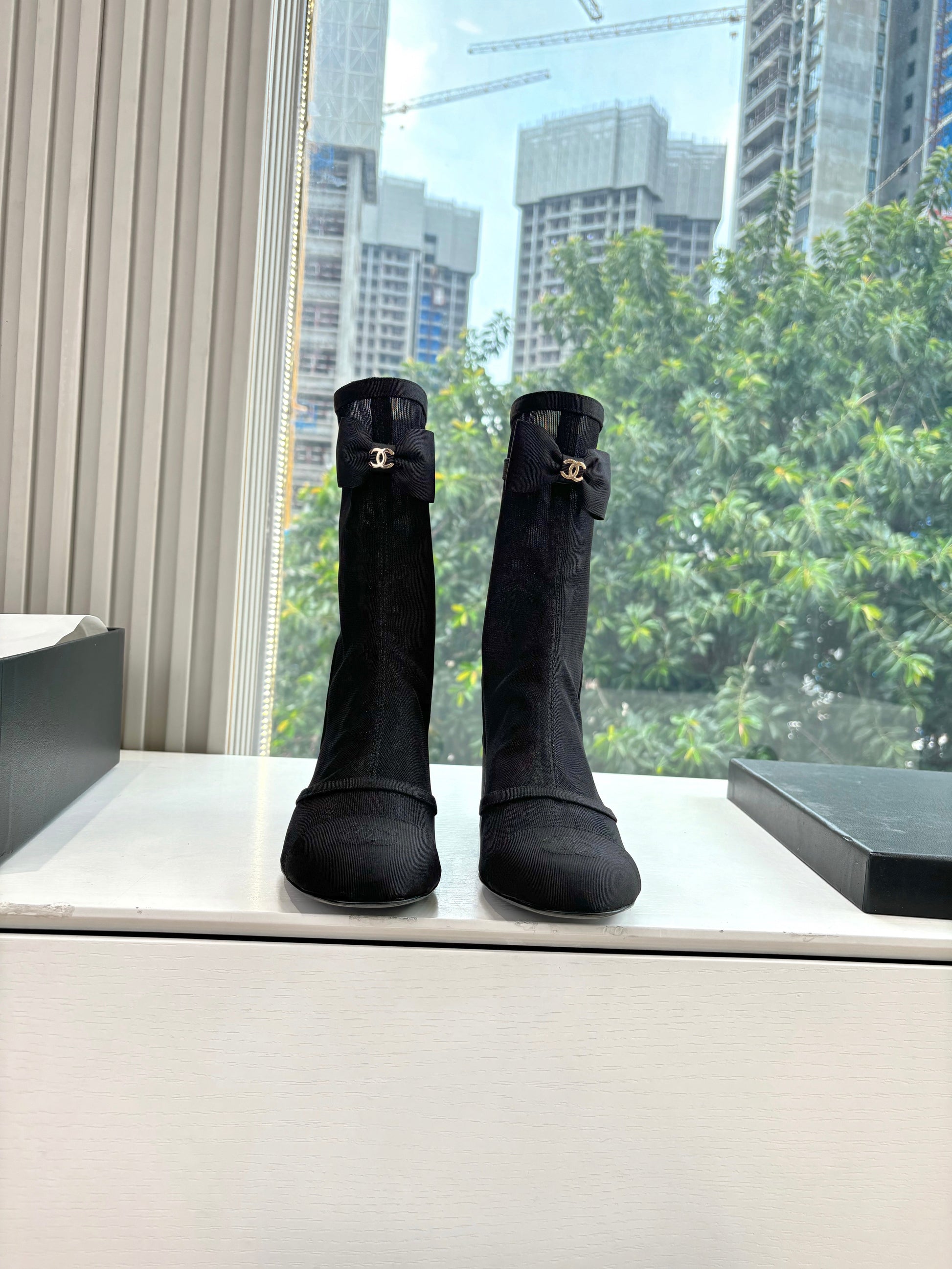 CC 25 Short Boot Black Mesh Calfskin Black Bow 430322