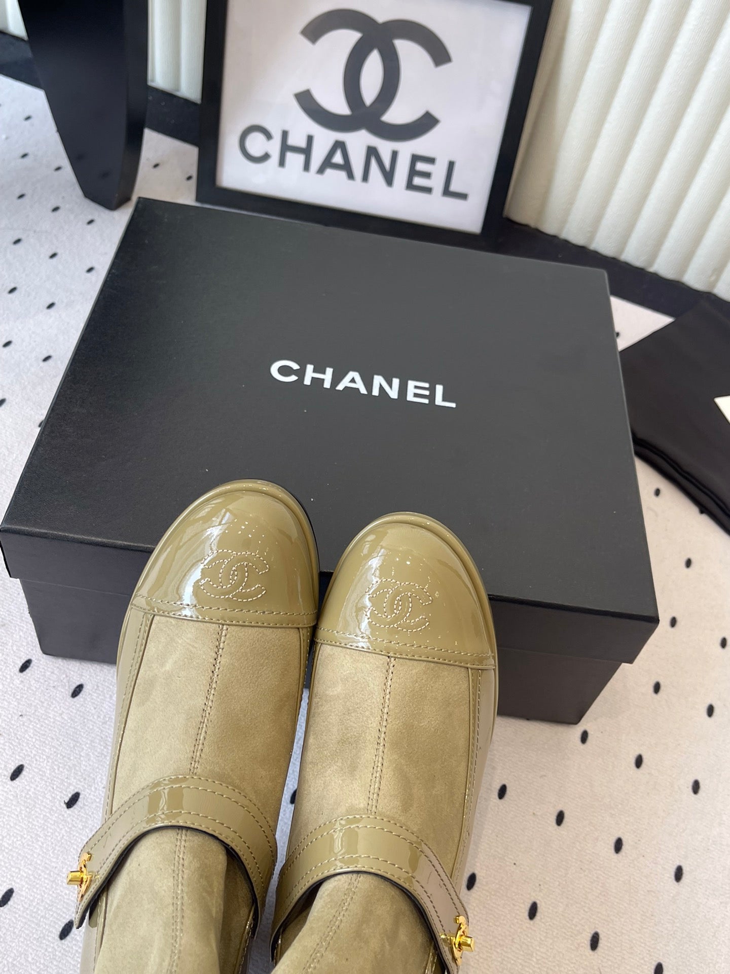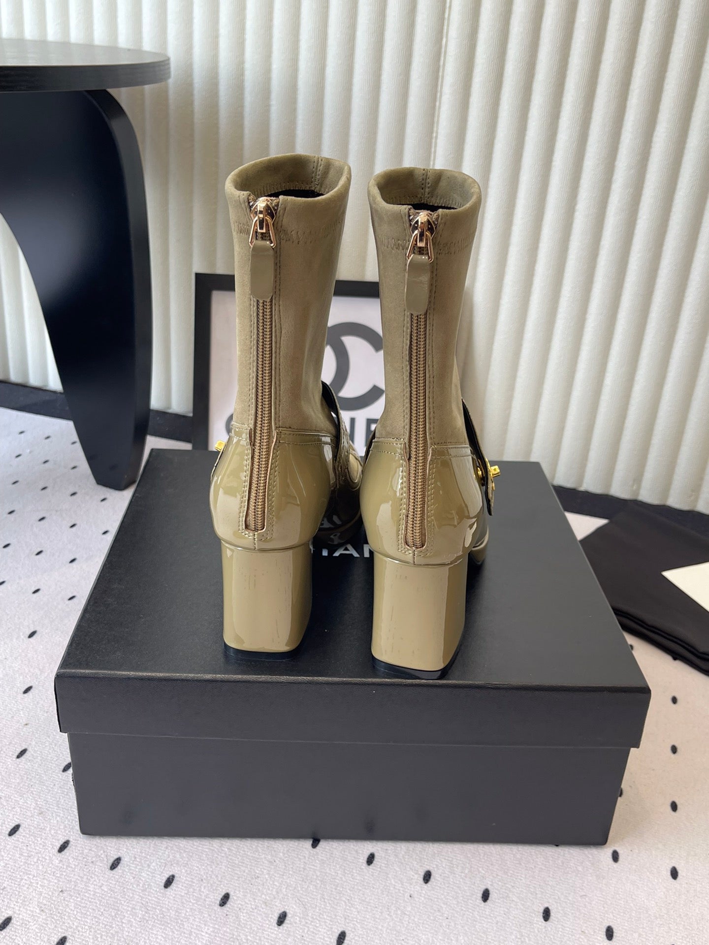 CC 25 Short Boot Olive Green Suede Patent Leather 514104