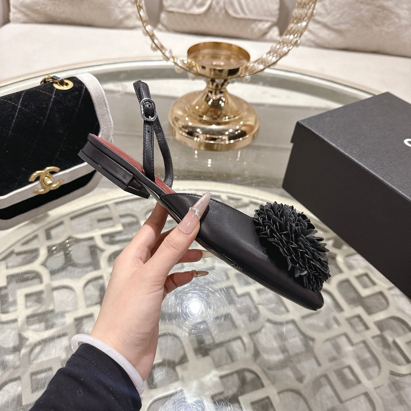 CC 26s Floral Backless Sandals Black Sheepskin 627019