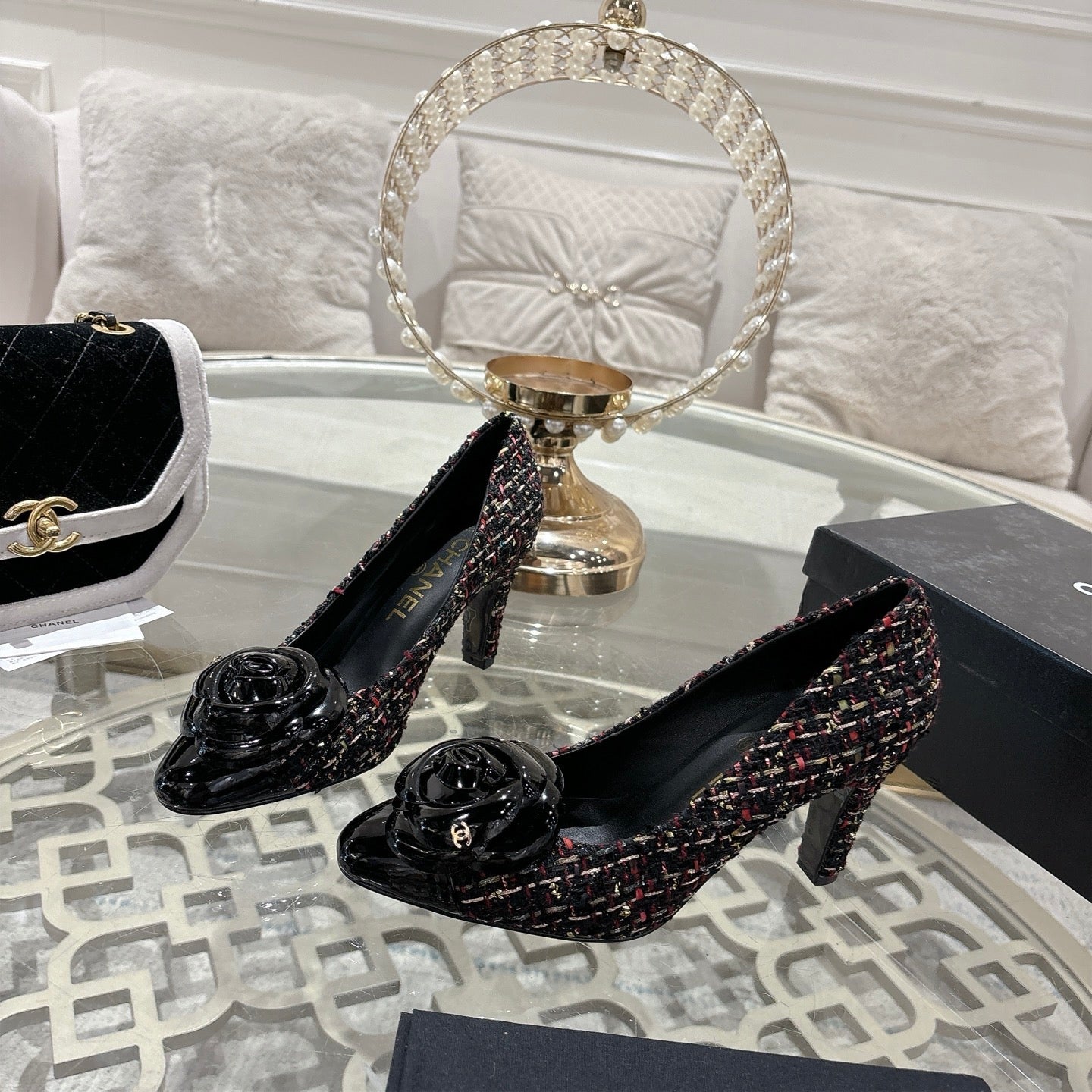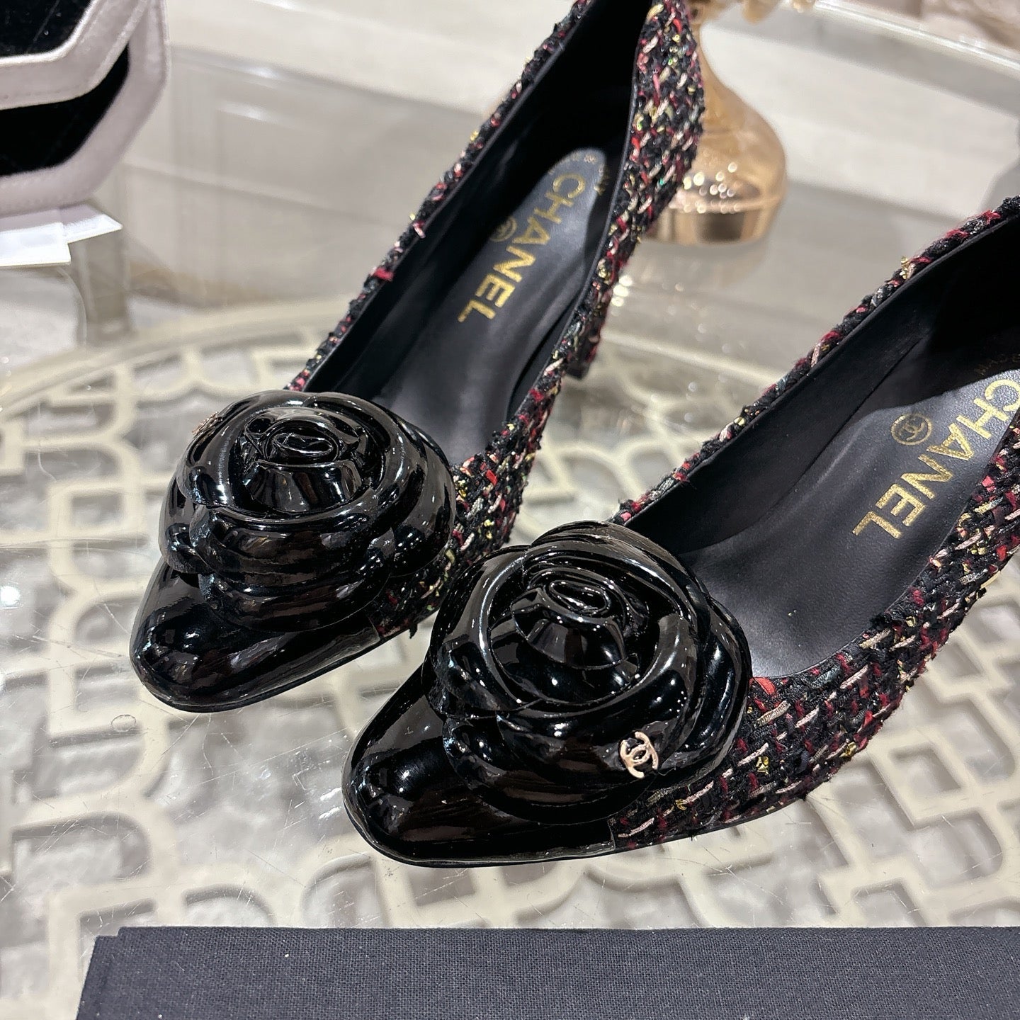 CC 26s High Heels Pump 85 Black Colorful Wool Fabric 627014