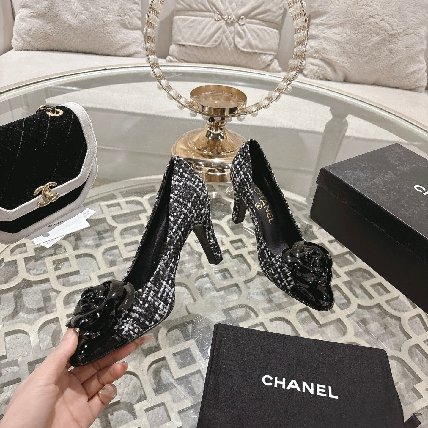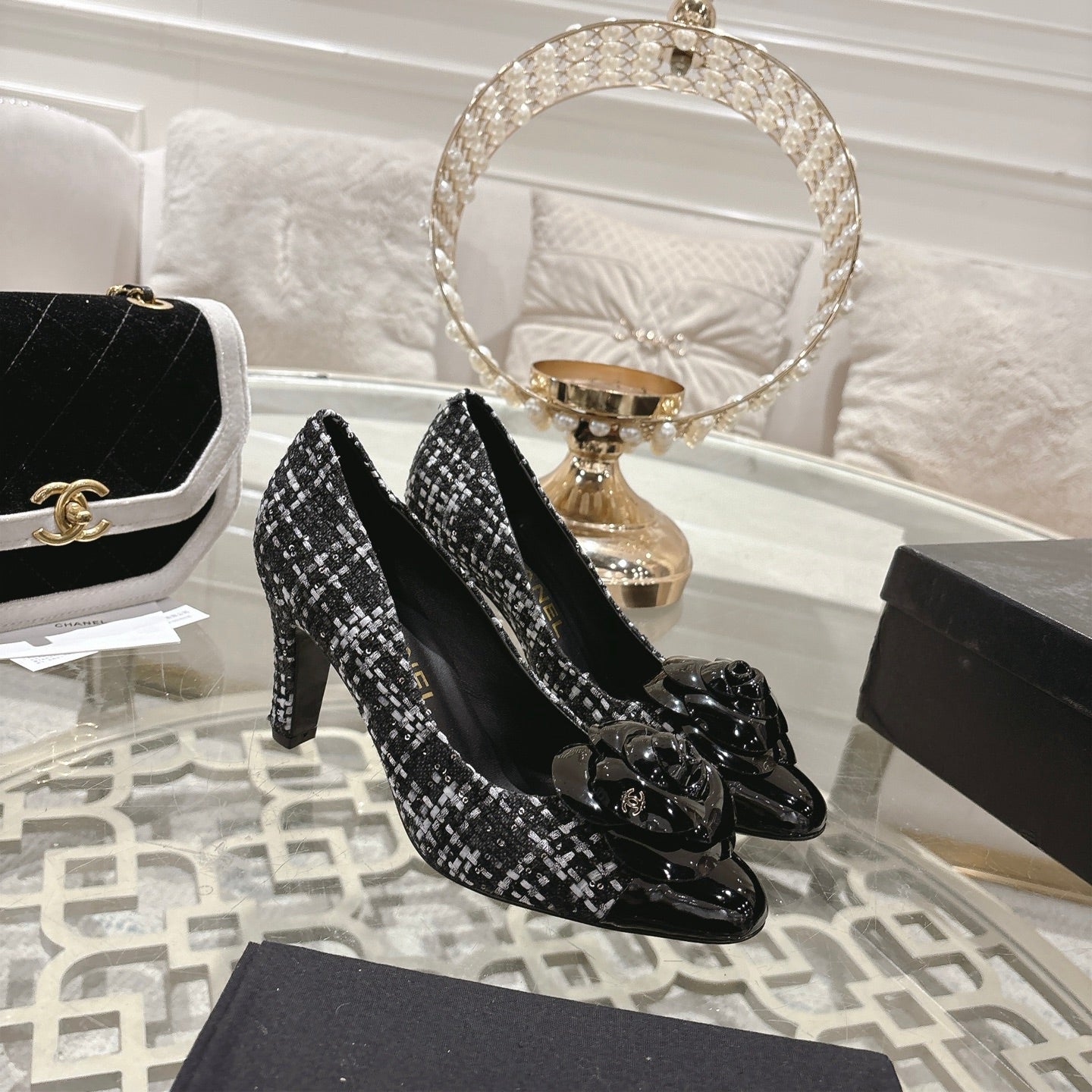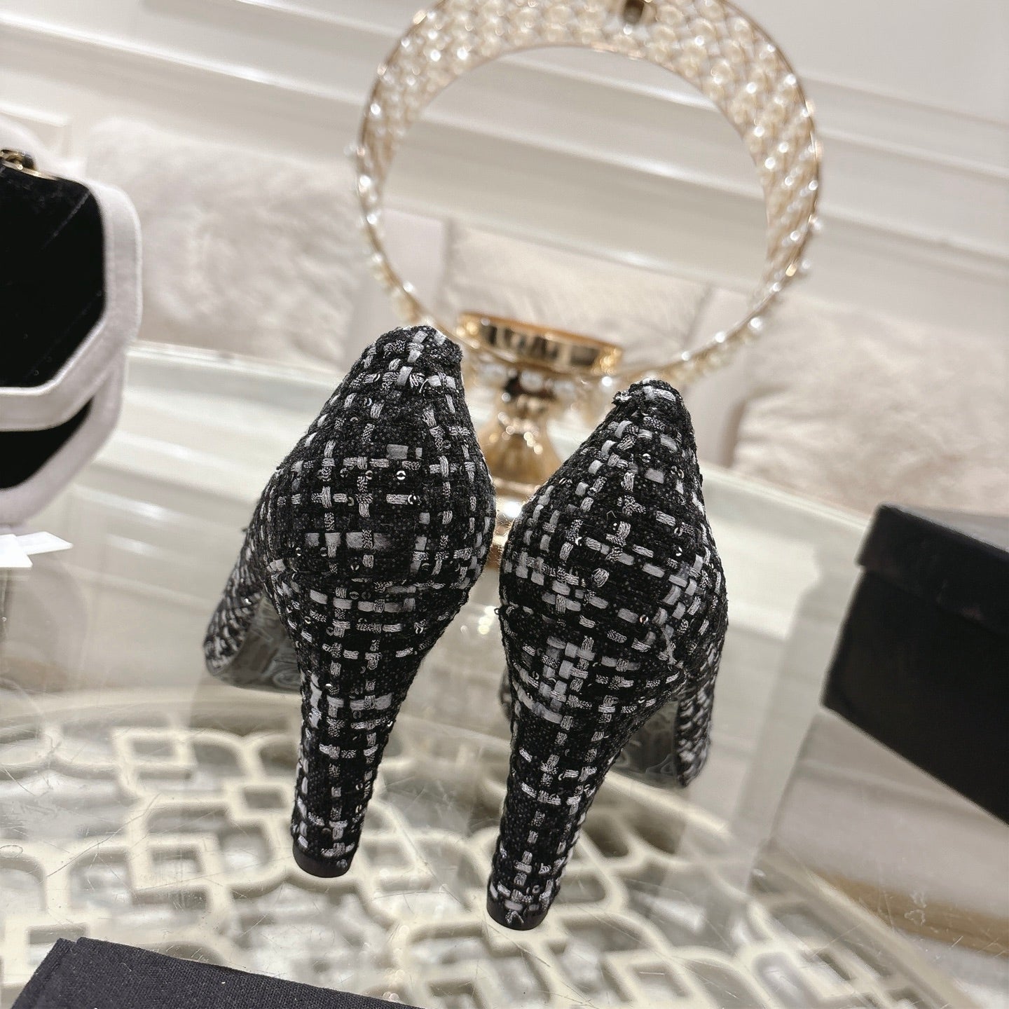 CC 26s High Heels Pump 85 Black White Wool Fabric 627015