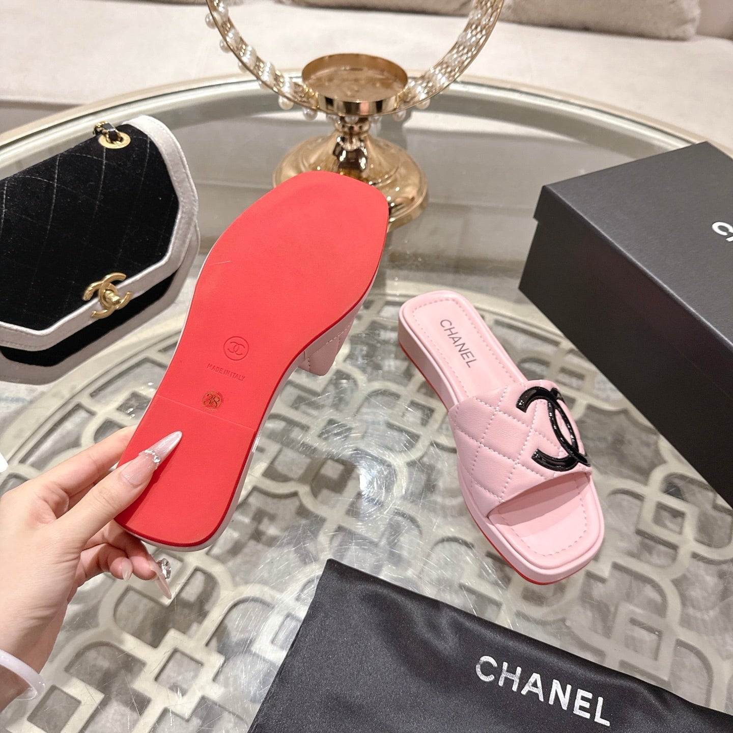 CC 26s Platform Slippers Pink Black Sheepskin 627071