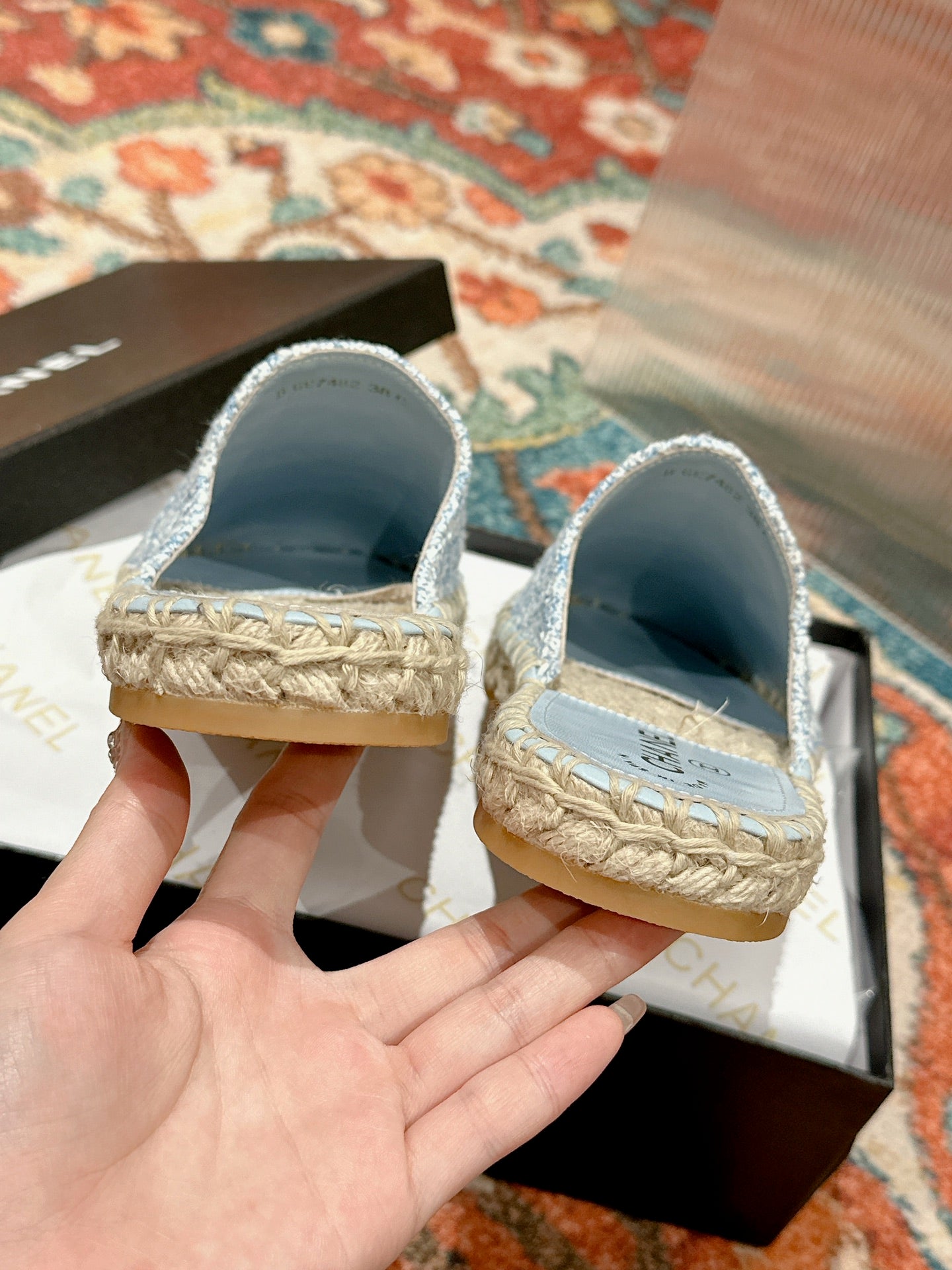 cc espadrilles mule cloud blue fabric white sequin
