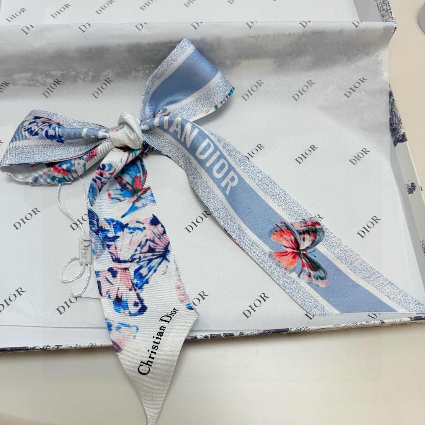 CD Twilly Mini Scarf 105cm Butterfly Light Blue Mulberry Silk 976489