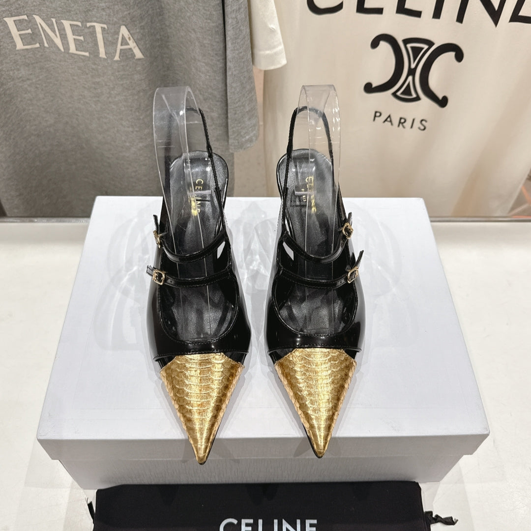 Celine 25C Judy Double Strap Mary Jane Slingback Black mix Gold Sheepskin 236775