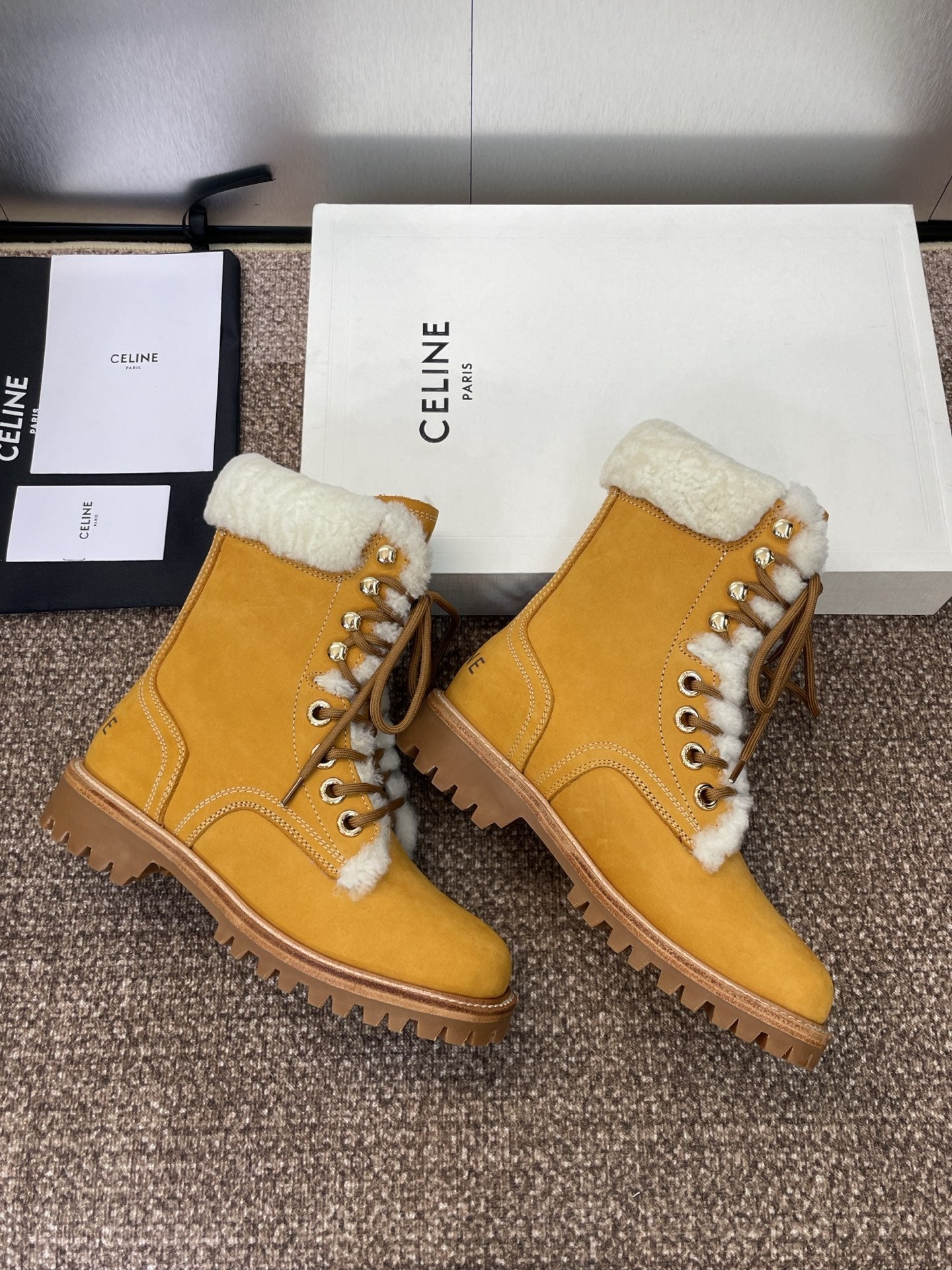 CELINE Ankle Boots Yellow White Suede Lambswool 433388