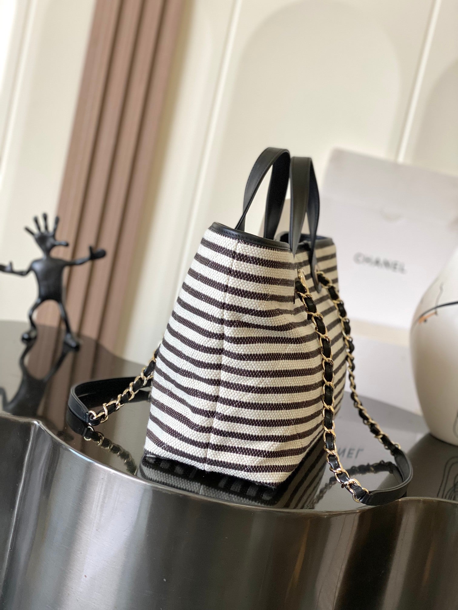 Chanel 2026 Deauville Tote Bag 46cm Black mix White Canvas Leather 331127