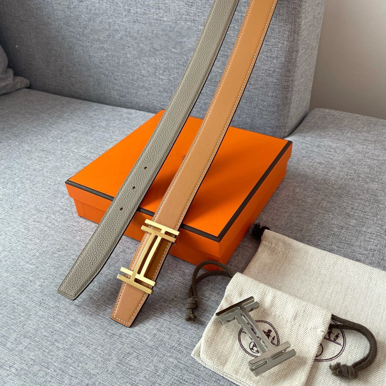 DOUBLE H REVERSIBLE BELT 32MM GOLD BUCKLE TIN GREY GOLD LEATHER