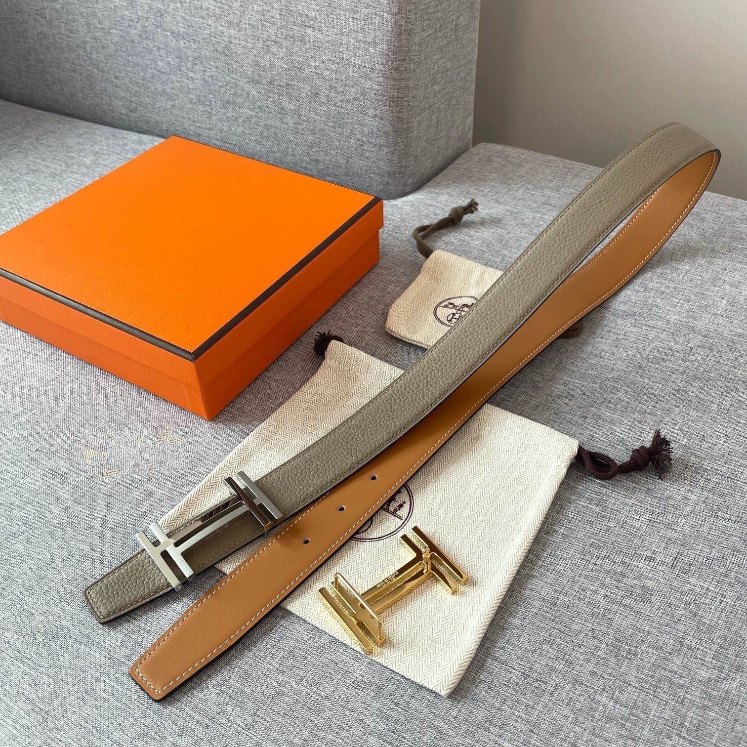 DOUBLE H REVERSIBLE BELT 32MM SILVER BUCKLE GOLD TIN GREY LEATHER