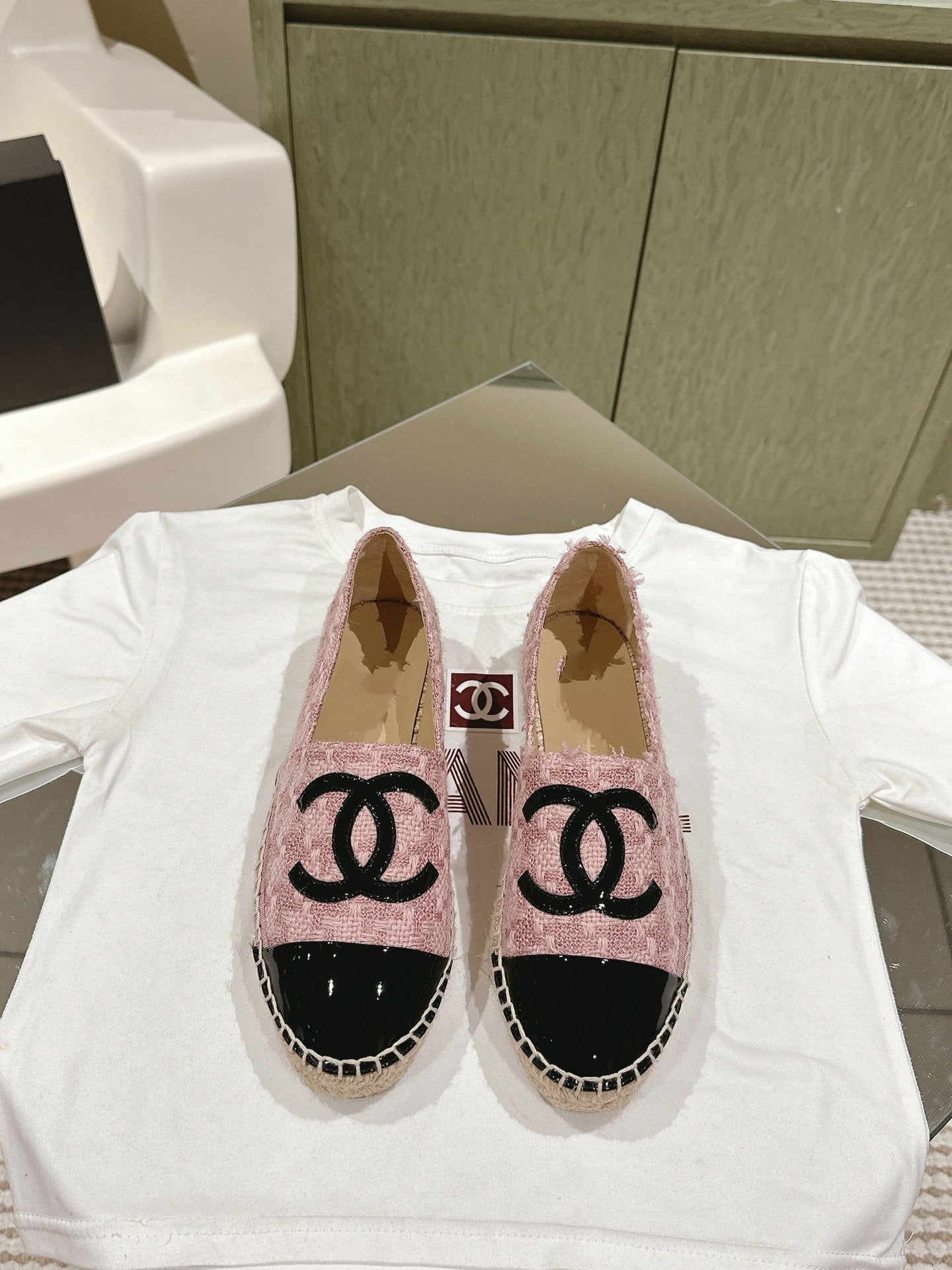 espadrilles pink tweed black patent calfskin