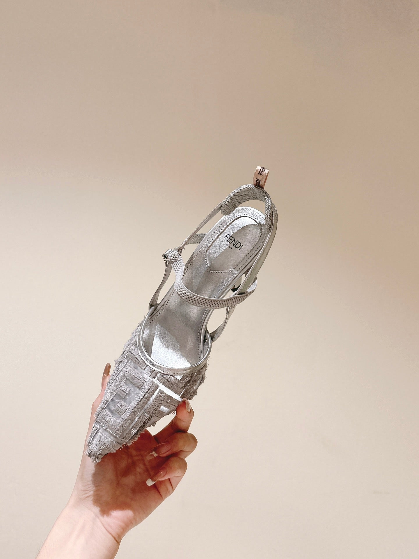 FENDI COLIBRÌ HIGH-HEELED SLINGBACKS 75MM IN LIGHT GREY FABRIC
