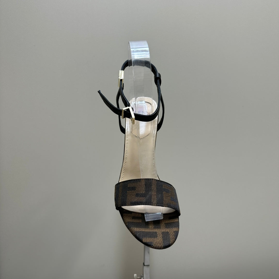 FENDI DELFINA HIGH-HEELED 10 CM SANDAL IN BROWN MONOGRAM FF CANVAS