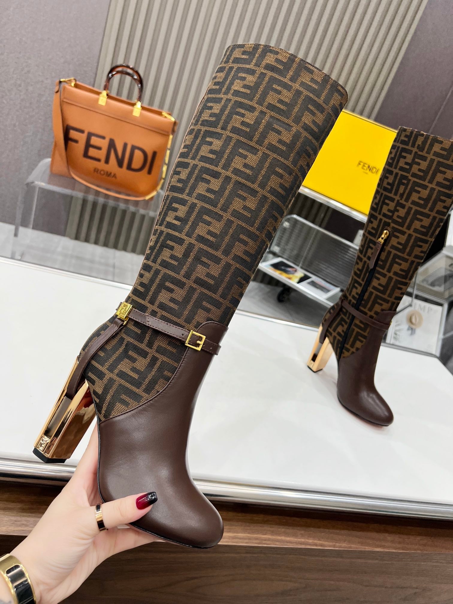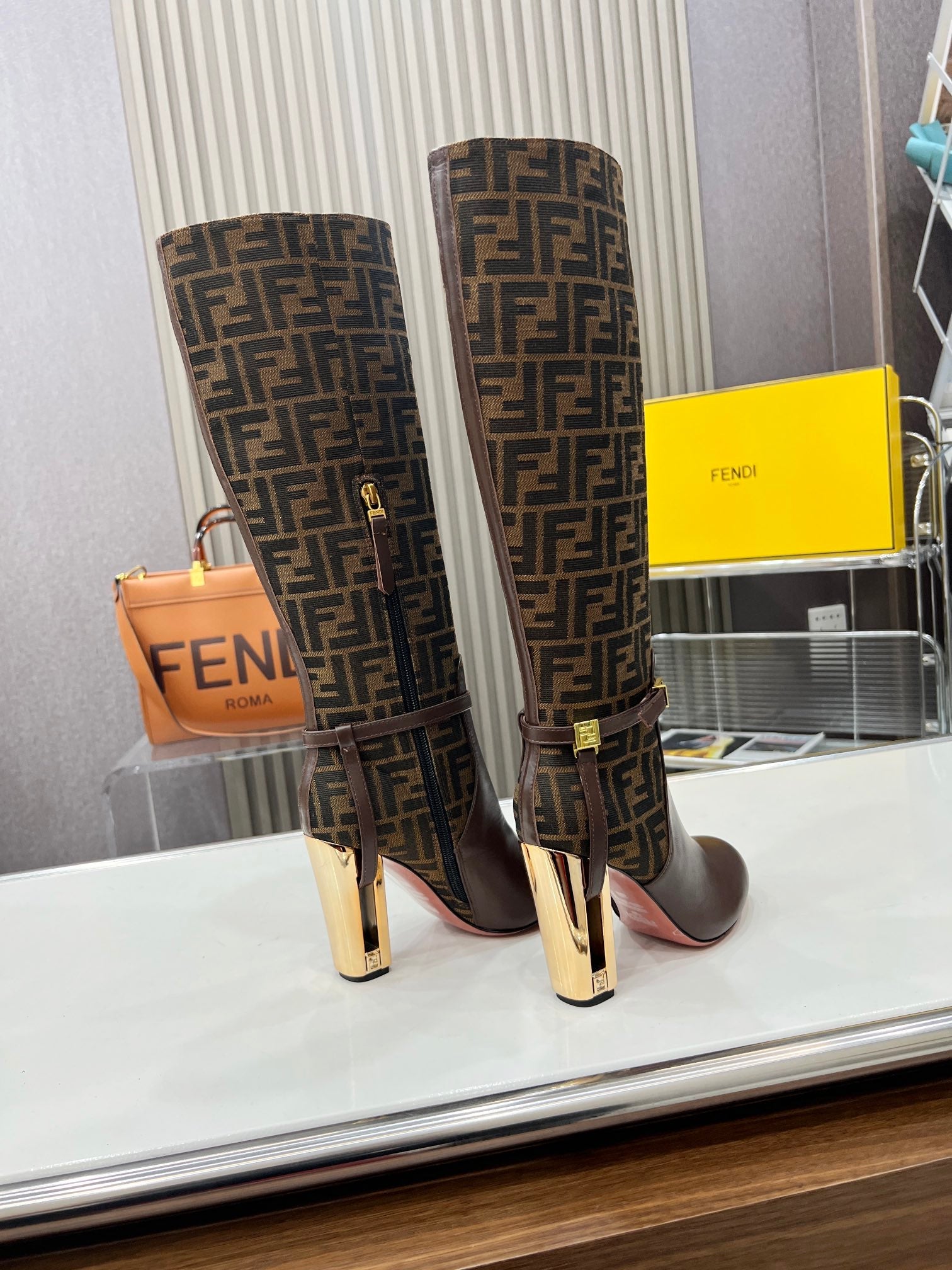 FENDI knee boots high heel monogram brown cowhide 521218