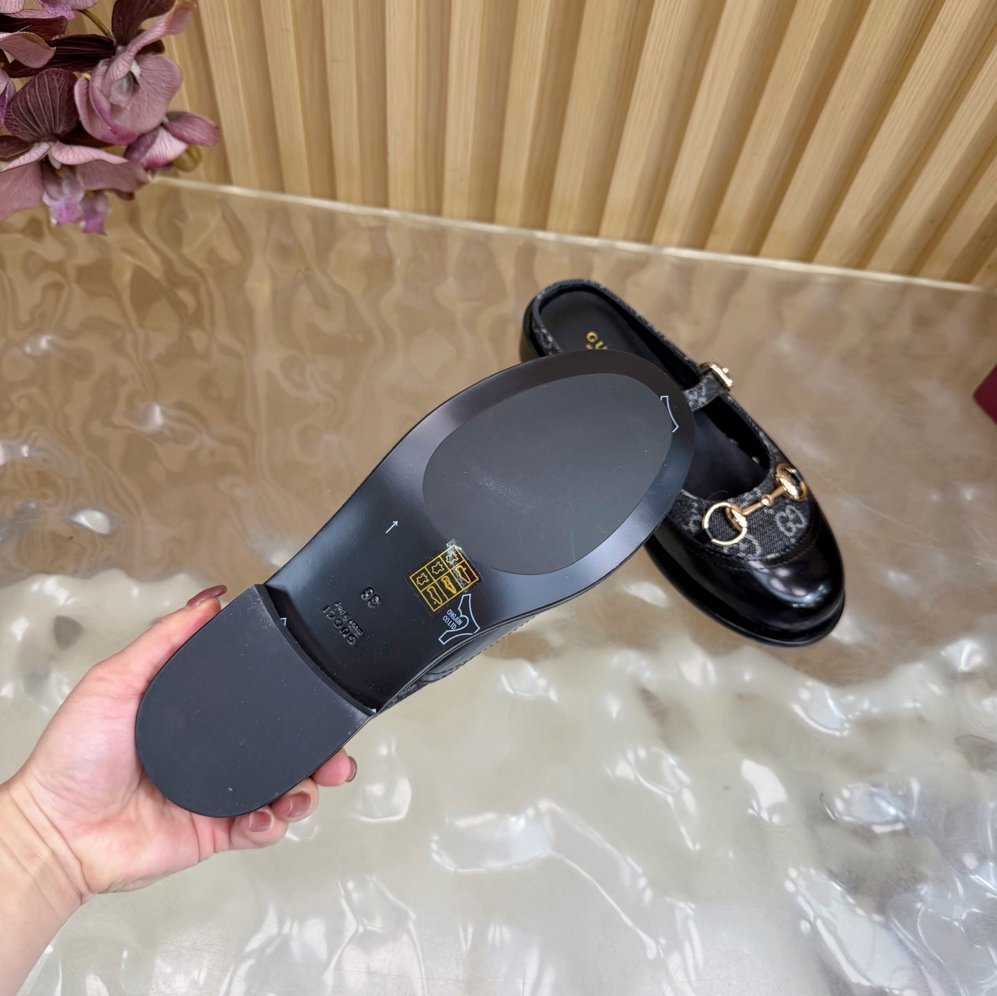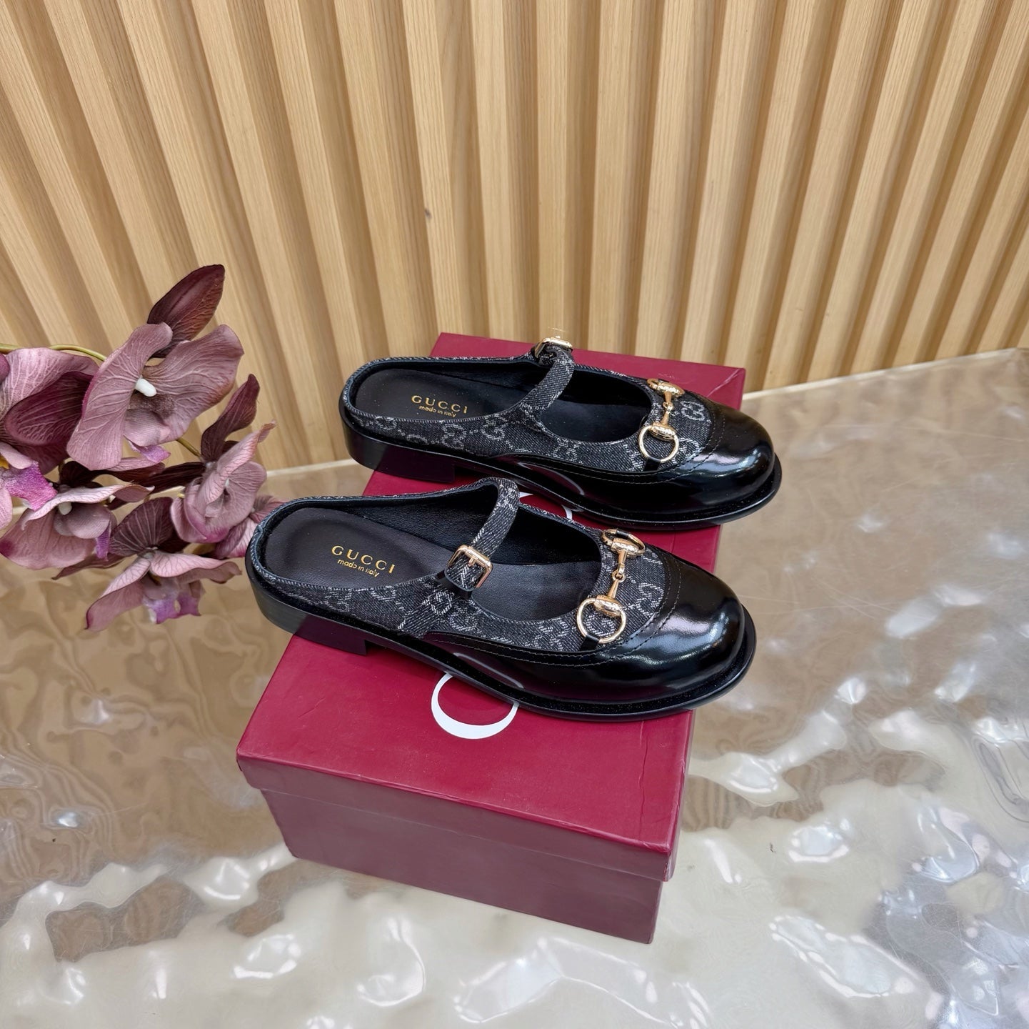 GG 26 Mule Black Beaded Leather Double G Fabric 589455