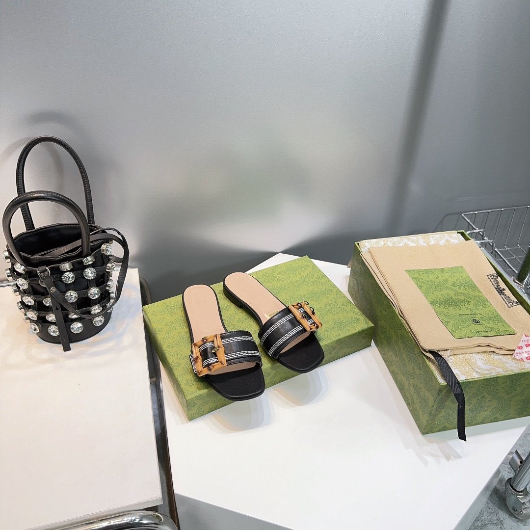 GG BAMBOO BUCKLE FLAT SANDALS BLACK