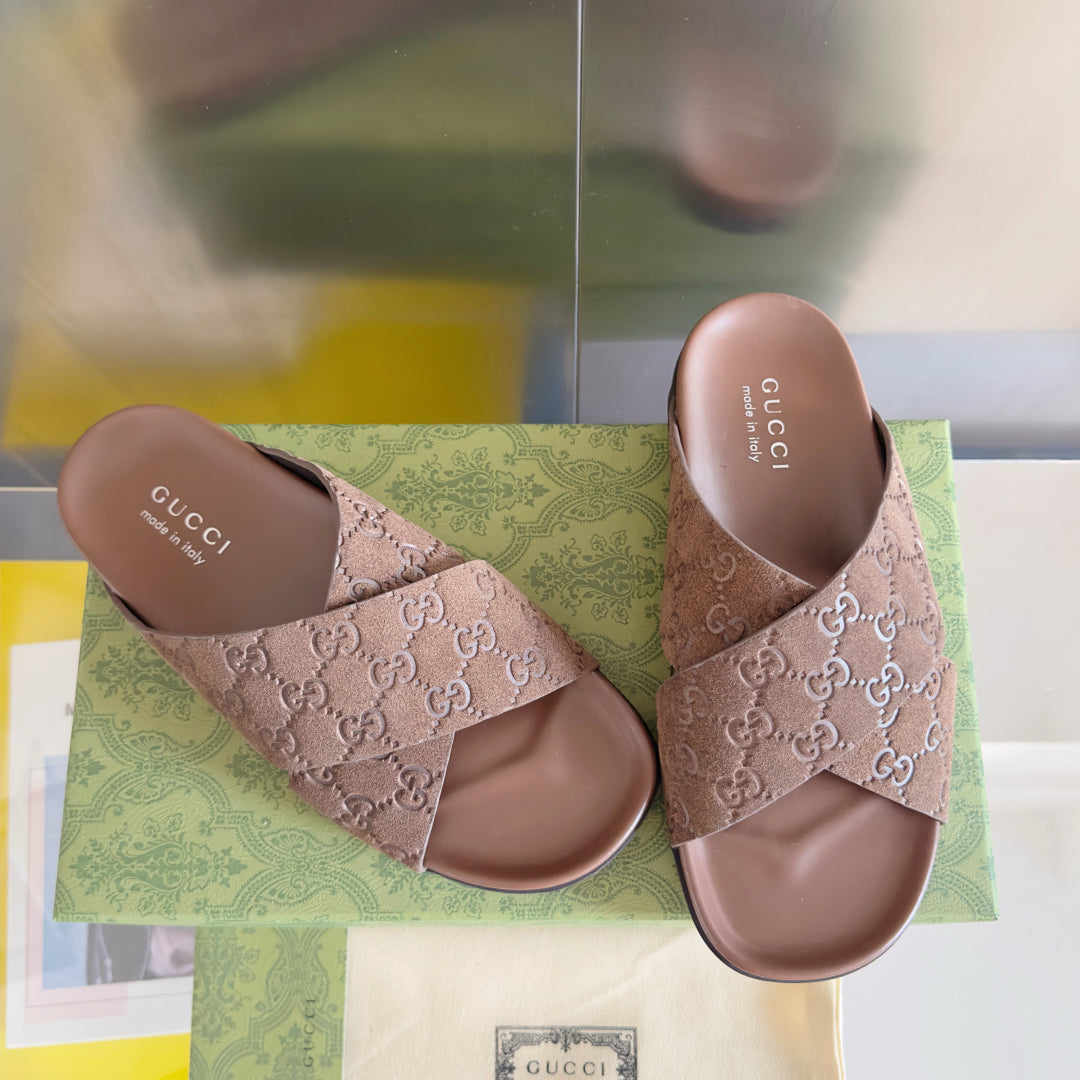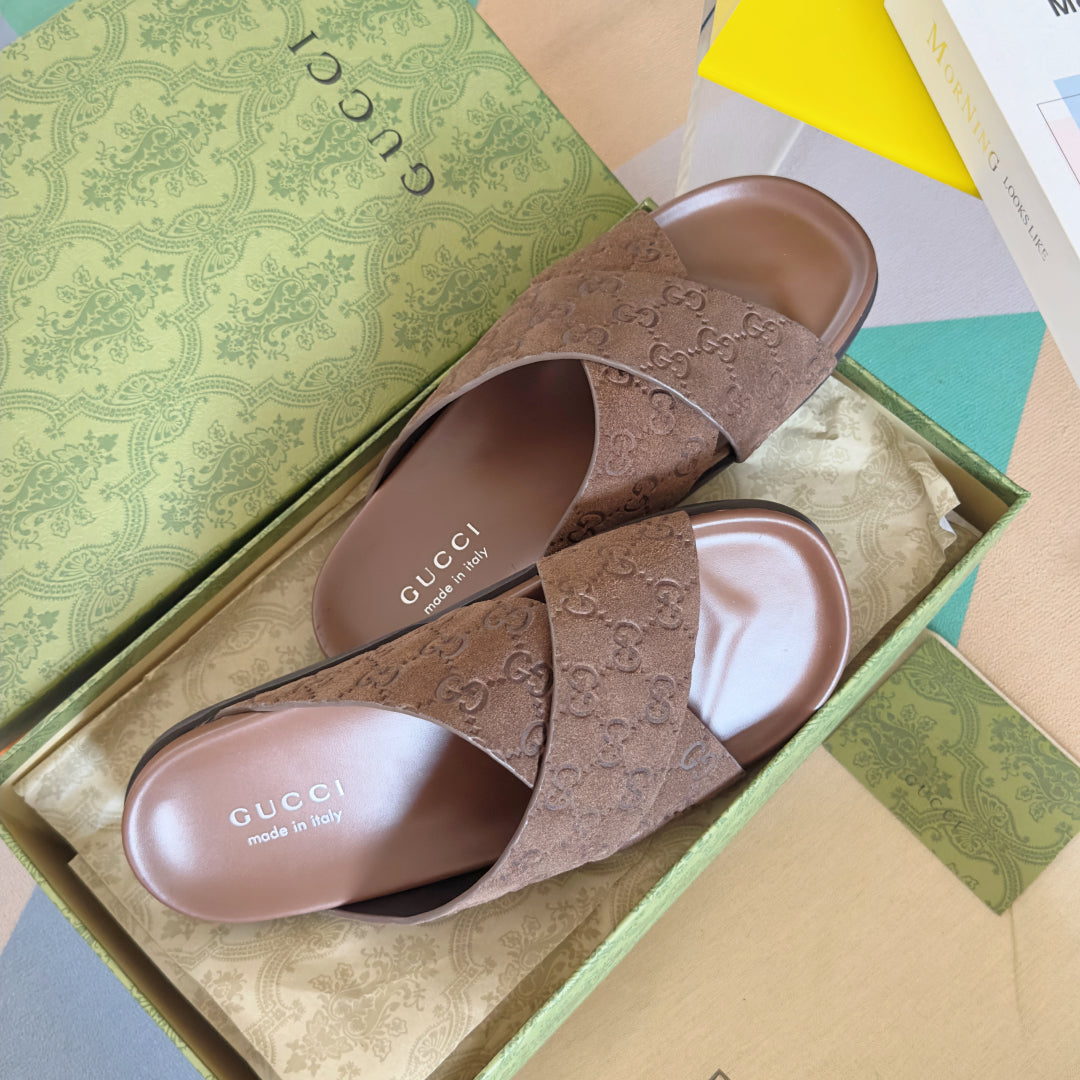 GG Men's Slide Brown Embossed Suede 595710