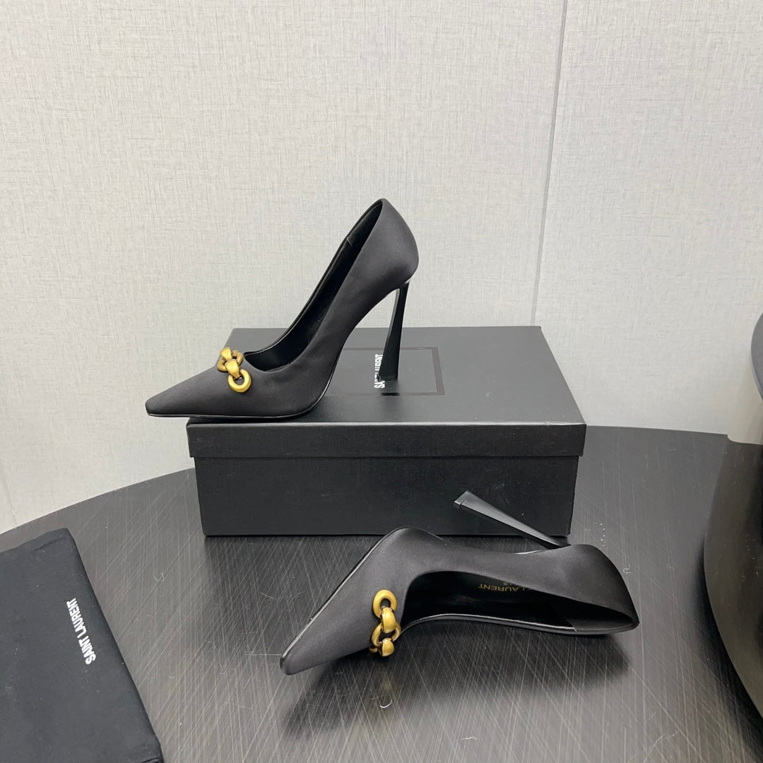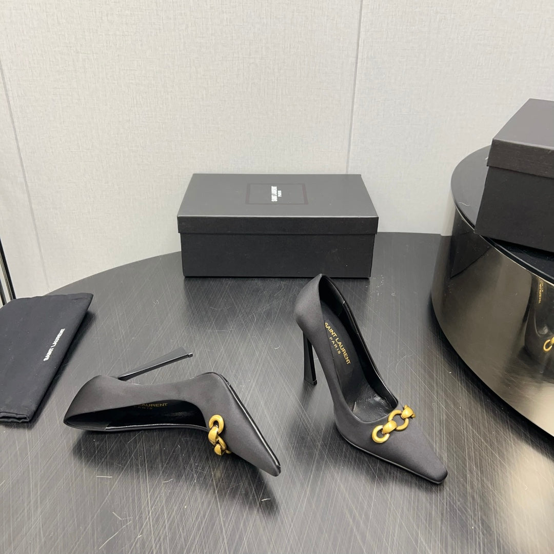 HIGH PUMPS IN BLACK SILK ATTACHED GOLD CHAIN