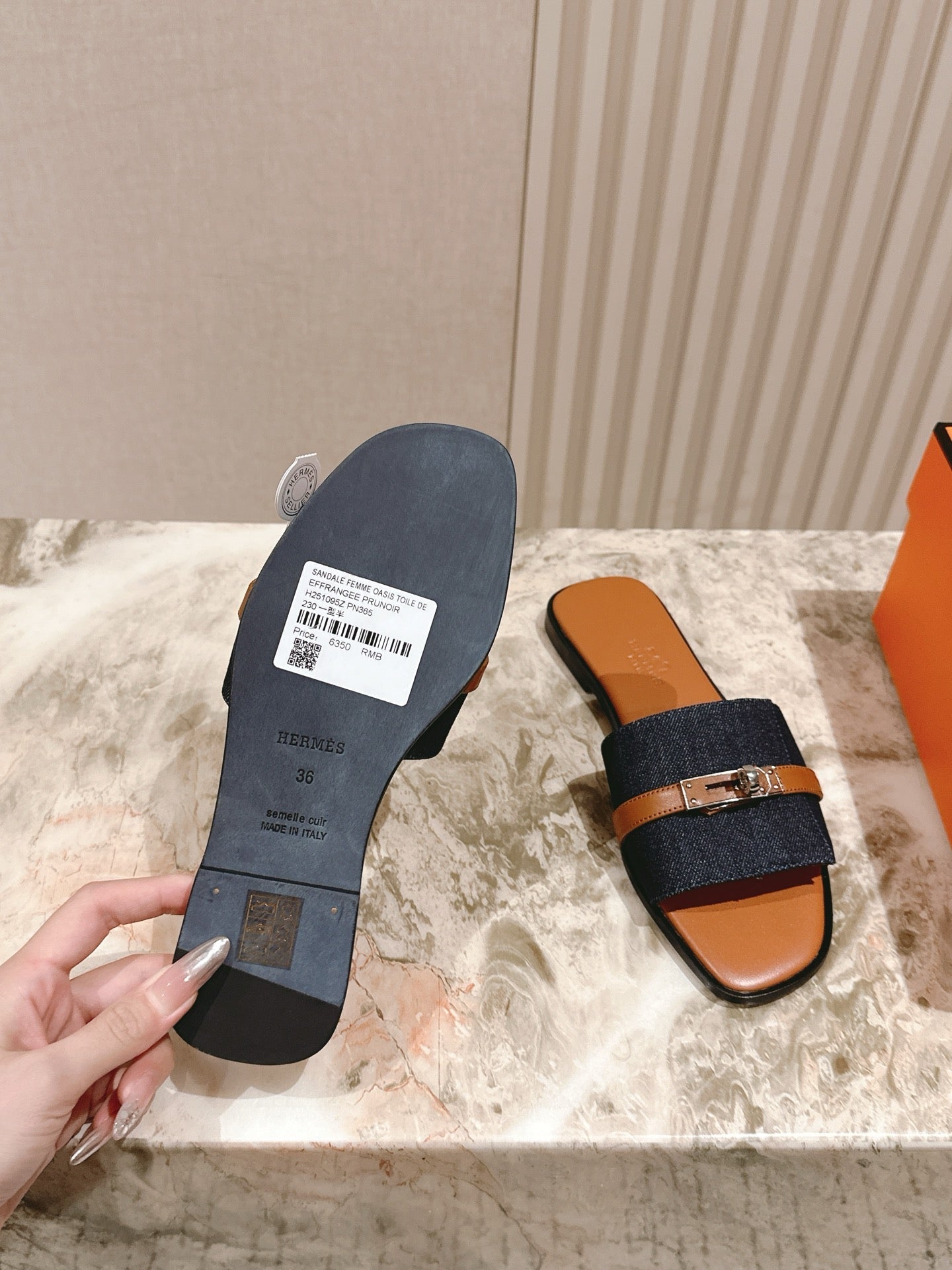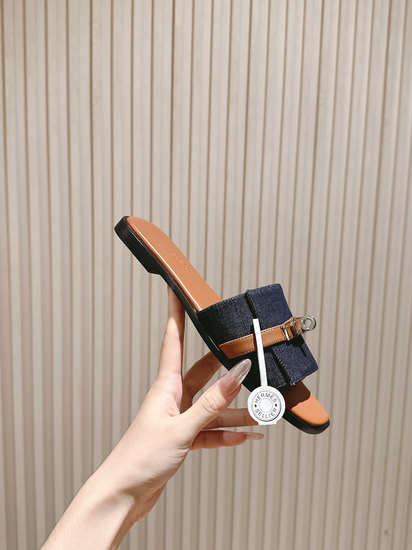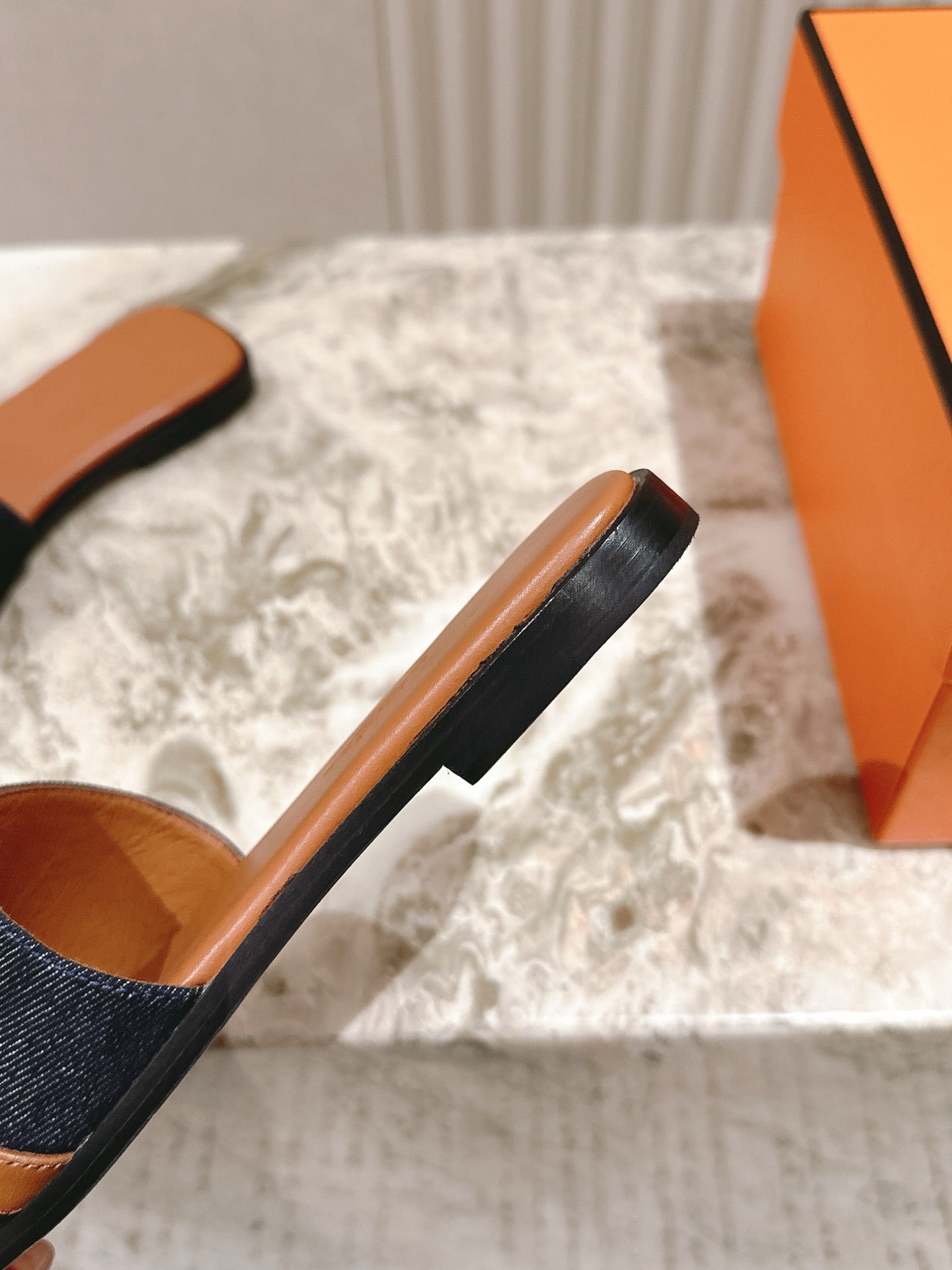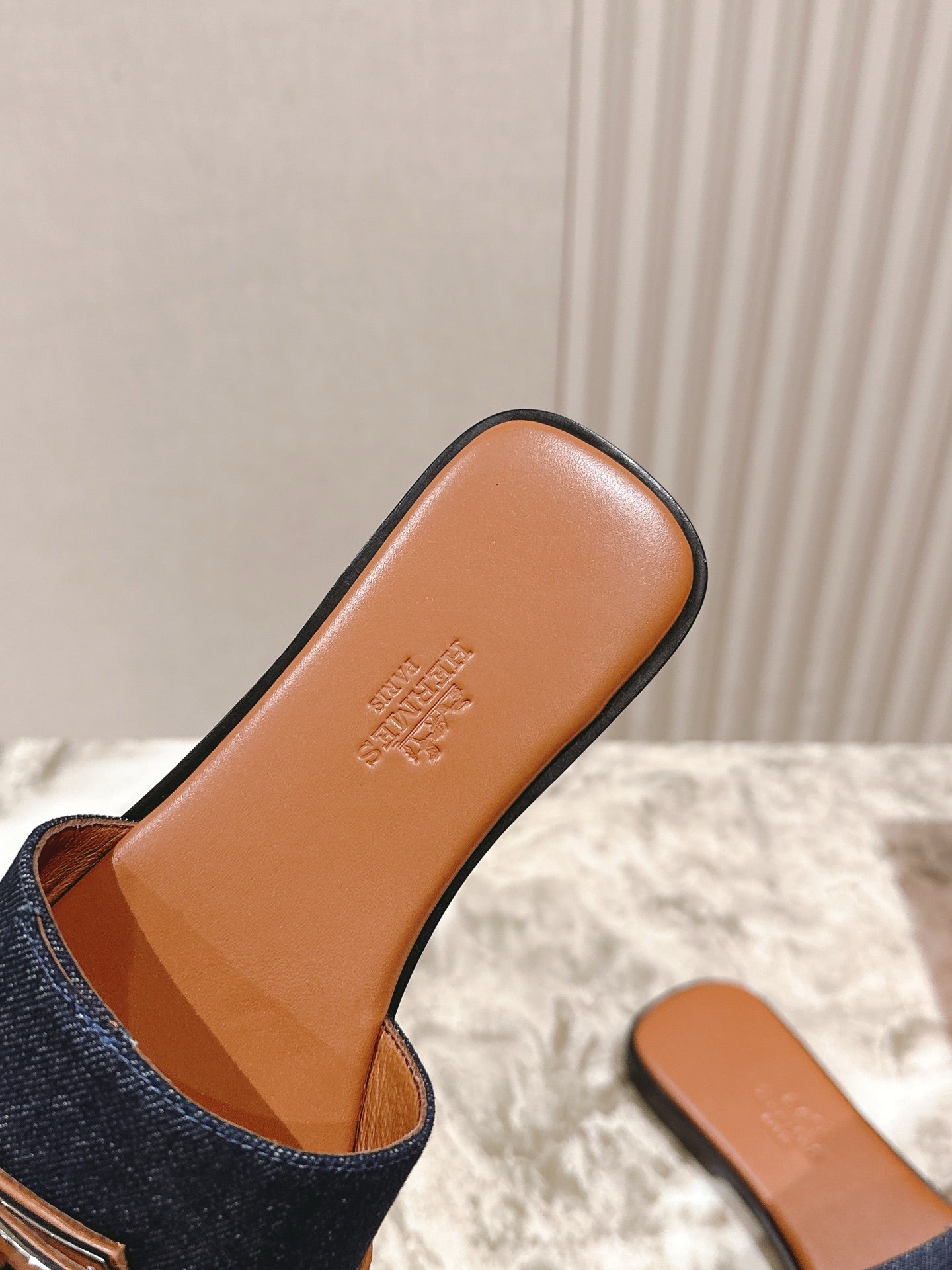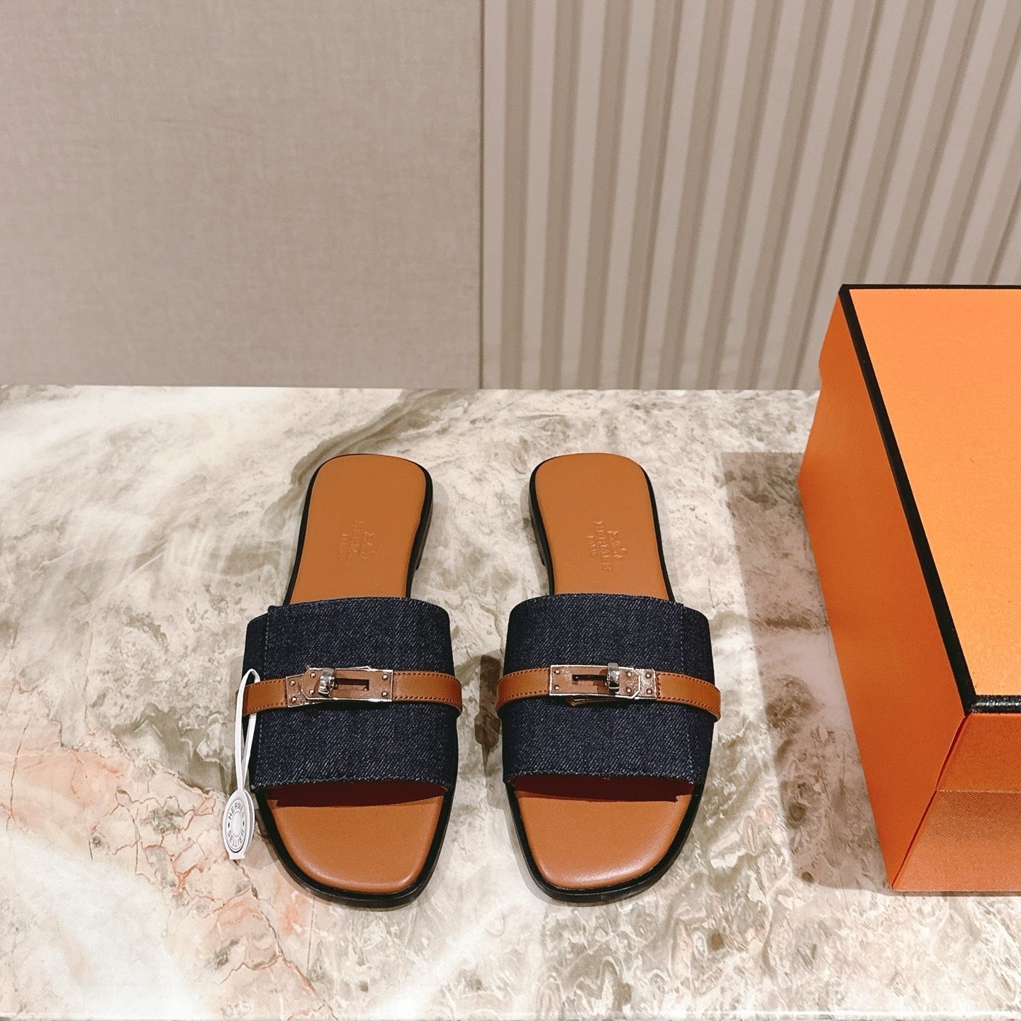 HM 2026 Flat Slippers Tan Brown Blue Denim Calfskin 655860