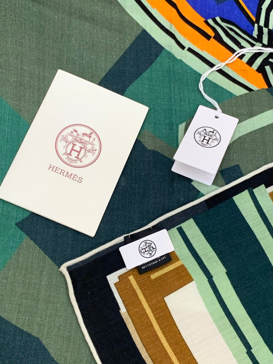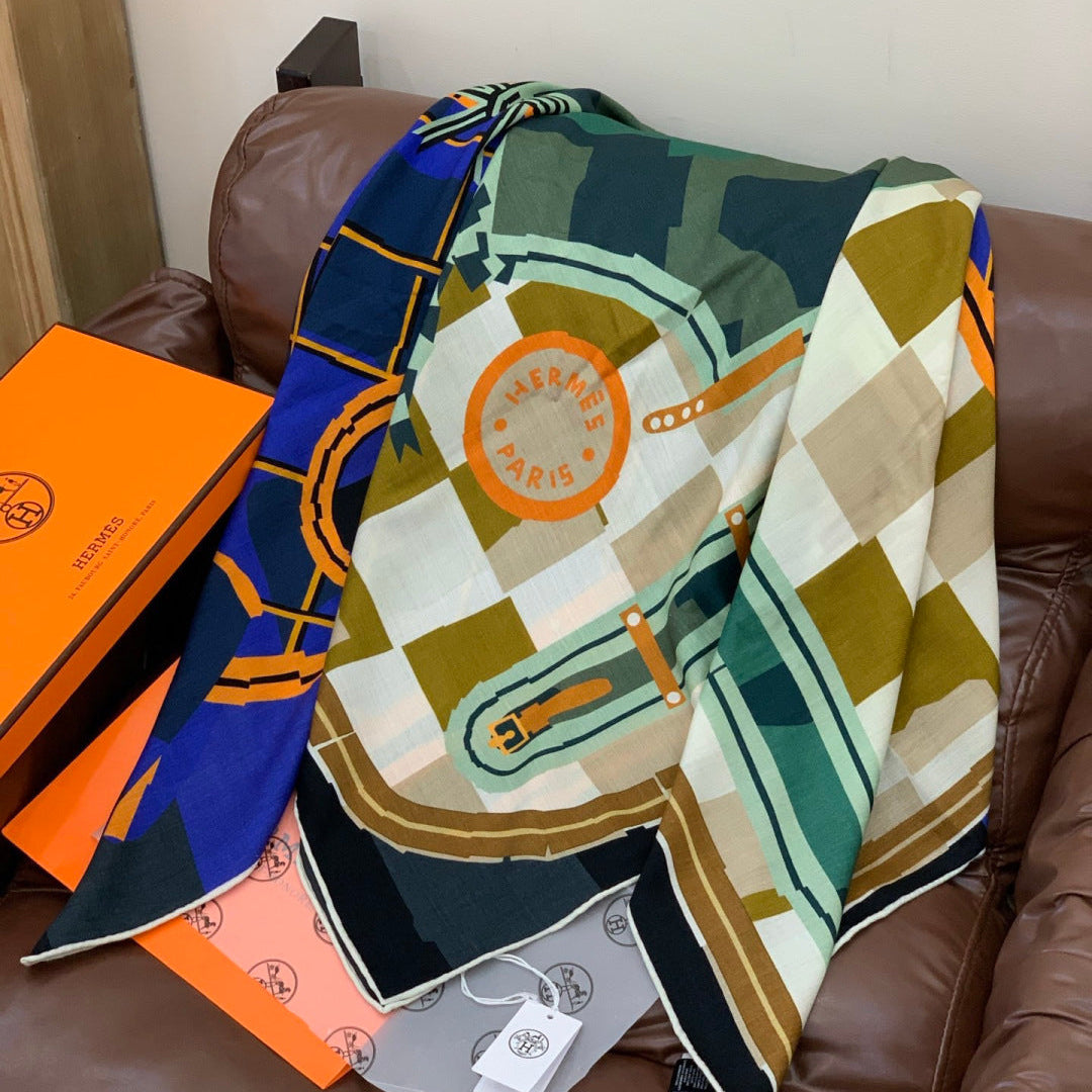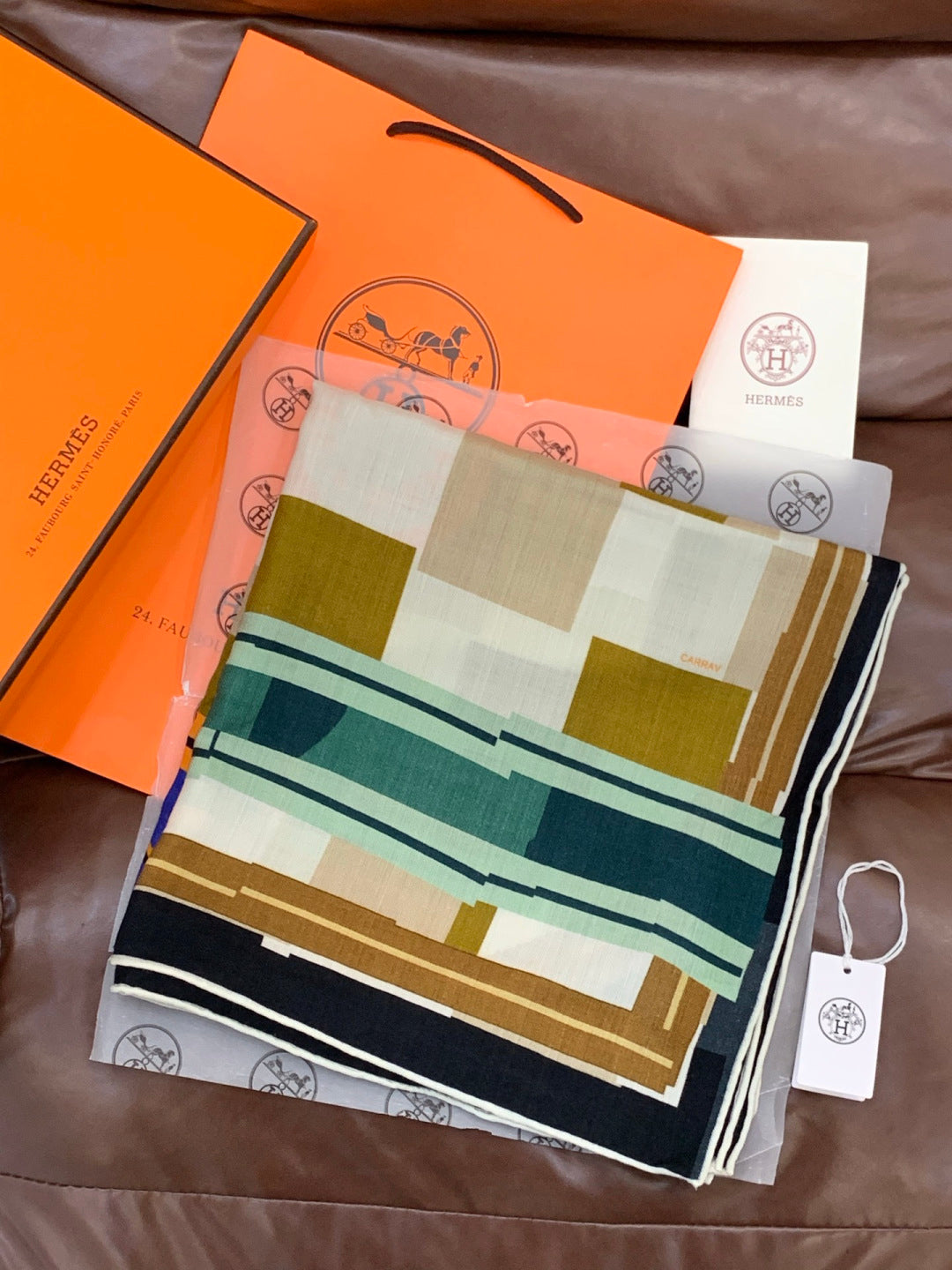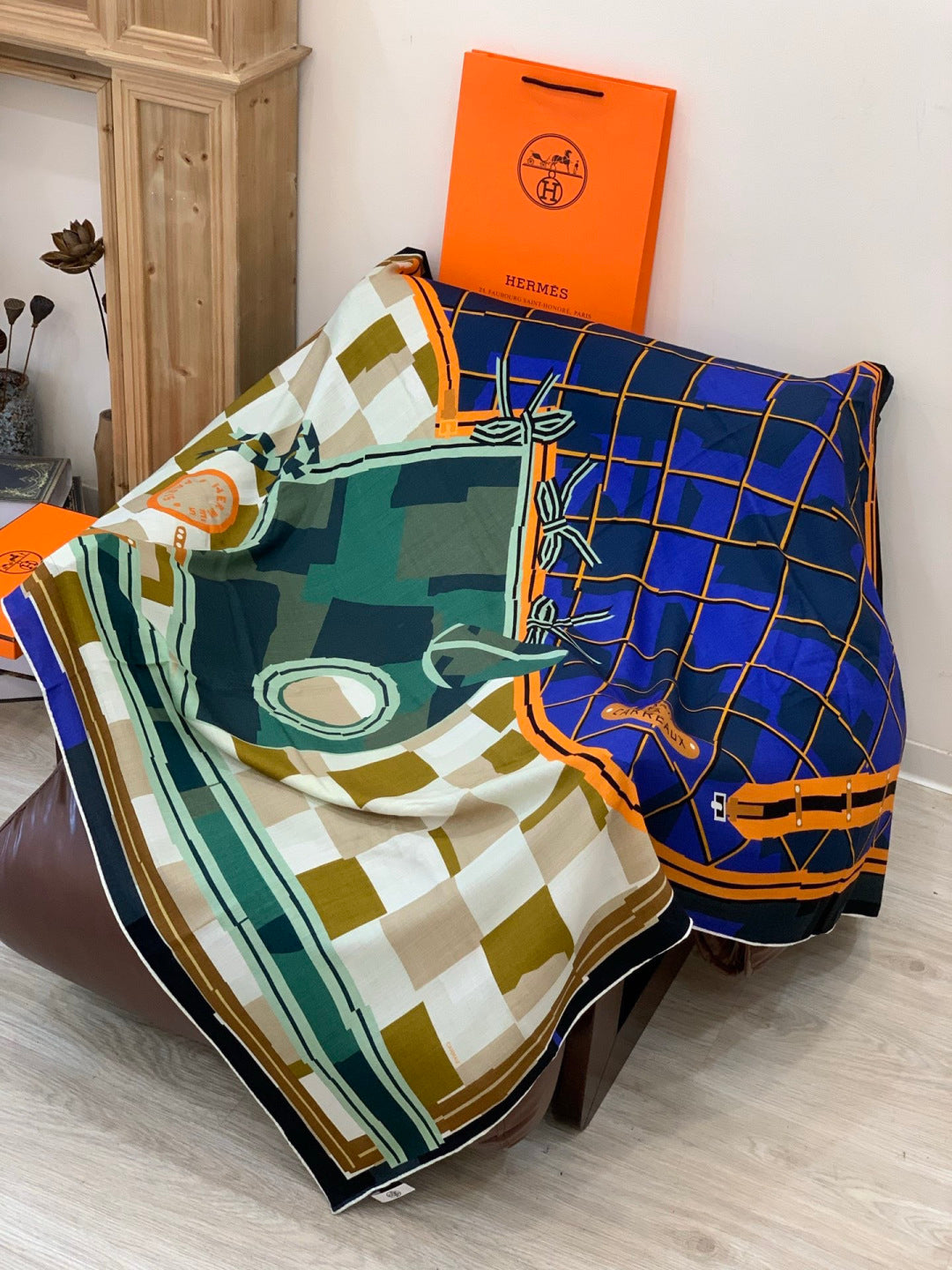 HM 25s Checkered Horse Scarf 140cm Green Blue Beige Cashmere Silk970933