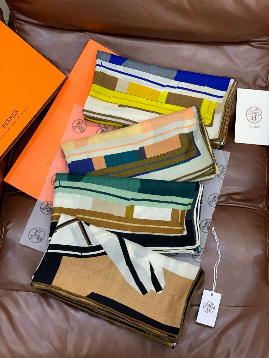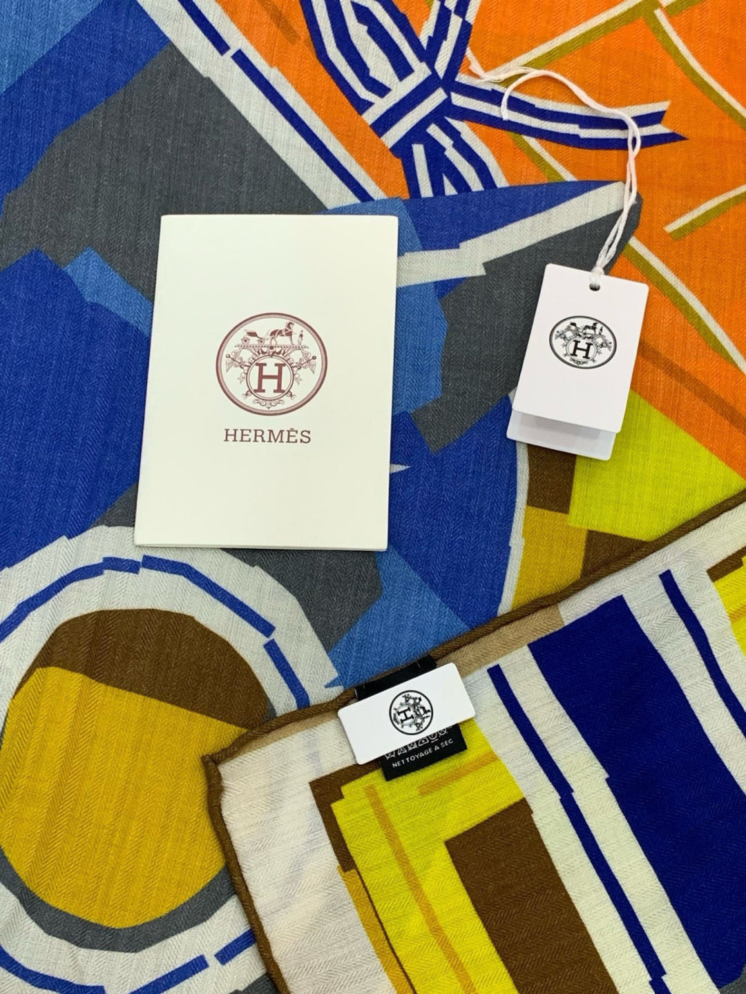 HM 25s Checkered Horse Scarf 140cm Orange Yellow Cashmere Silk 970932