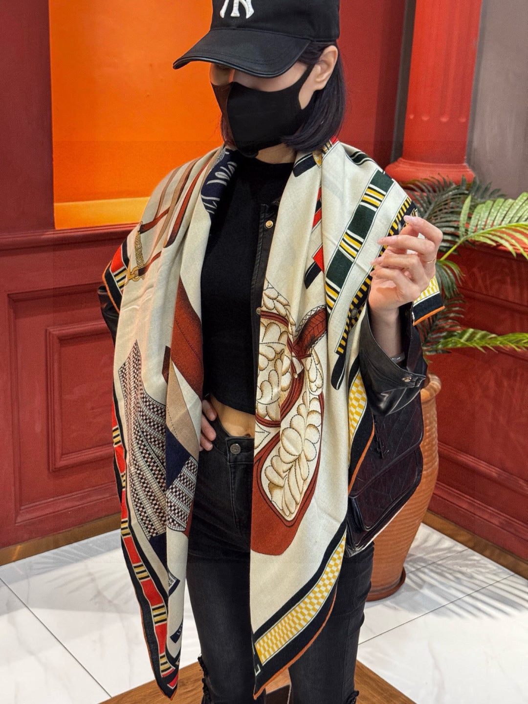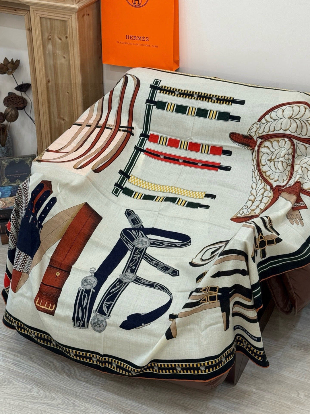 HM 25s Equestrianism Scarf 135cm Cream Black Cashmere Silk 970962