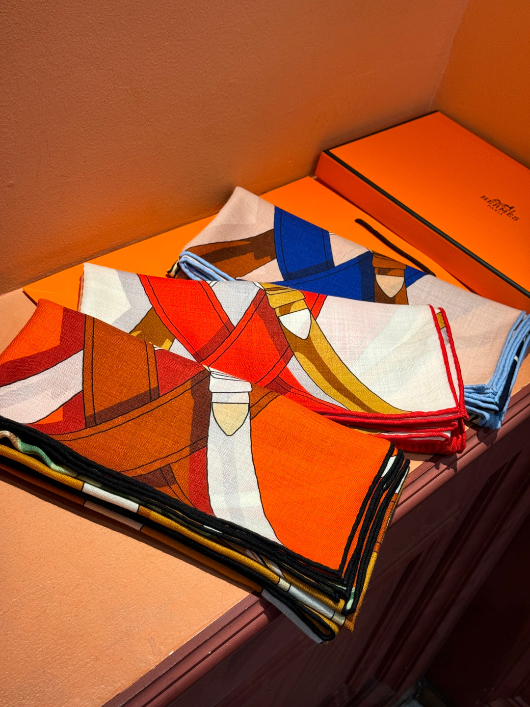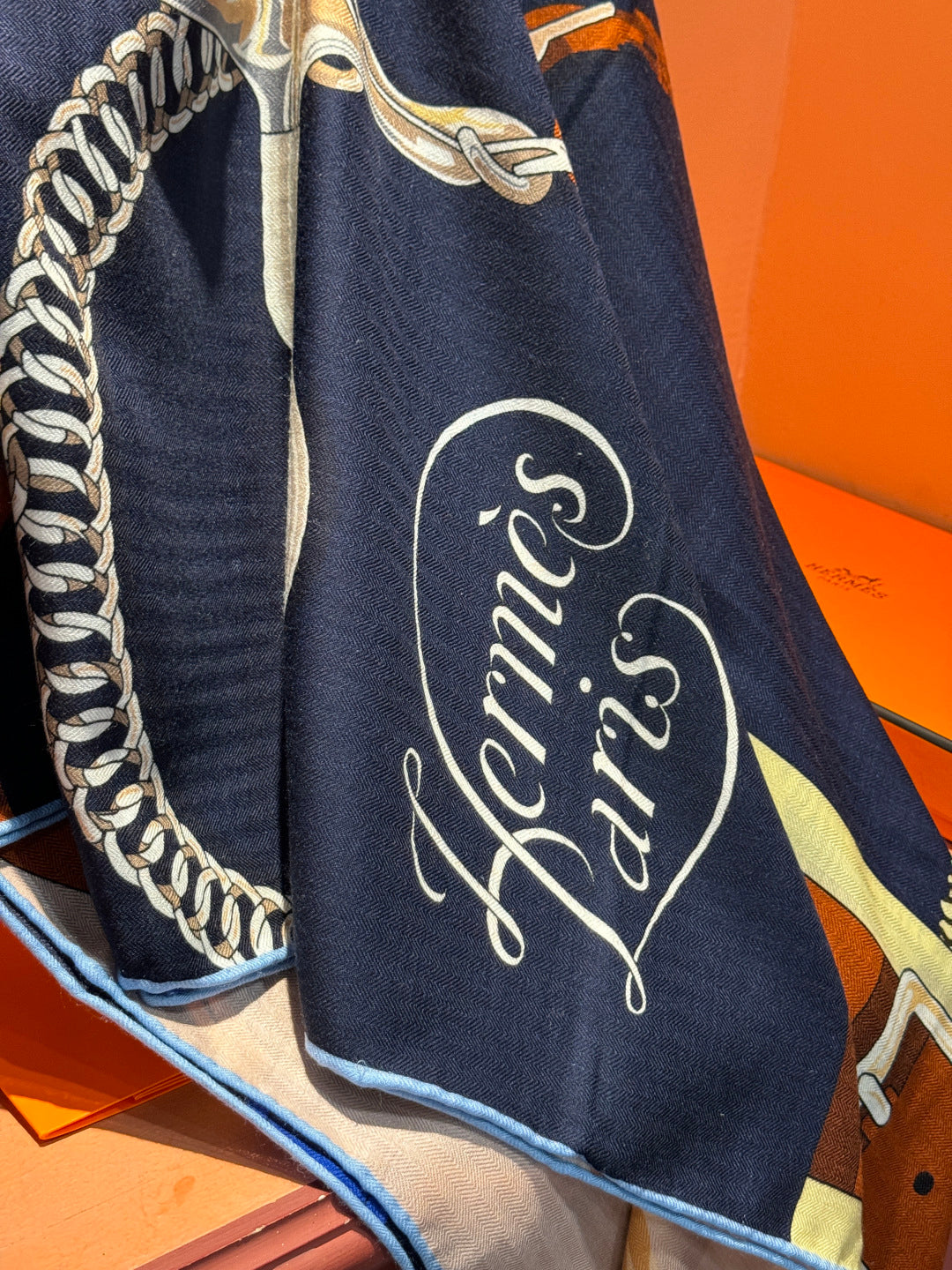 HM 25s Horse Reversible Scarf 140cm Blue Brown Cashmere Silk 967377
