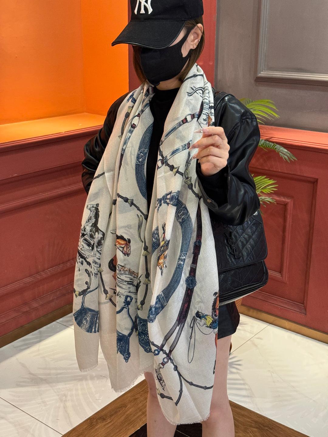 HM 25s Radiant Scarf 200cm White Blue Cashmere Silk 962391