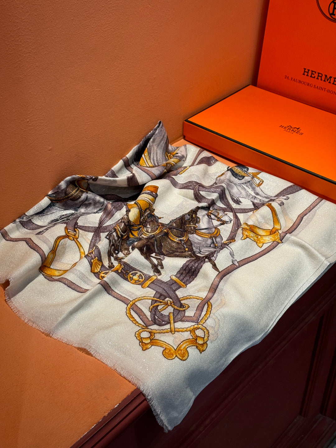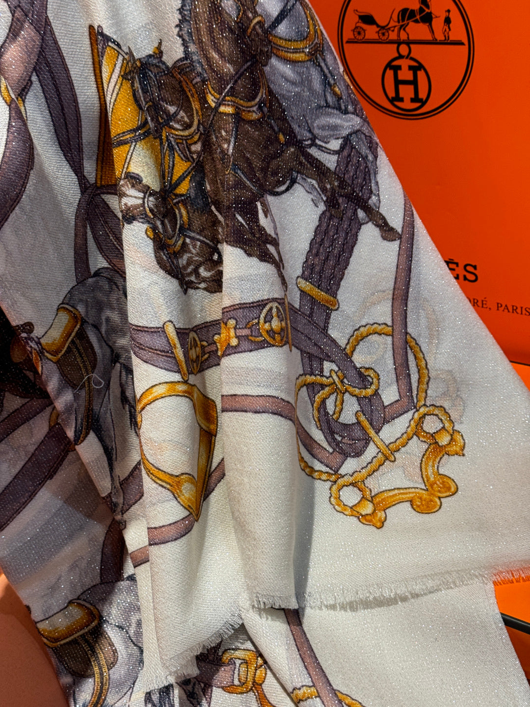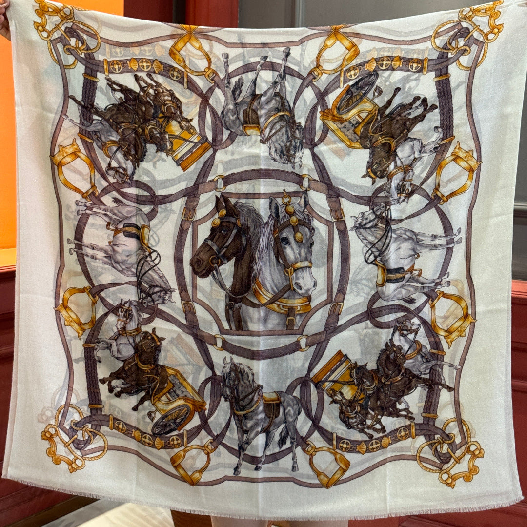 HM 25s Radiant Scarf 200cm White Purple Brown Cashmere Silk 962394