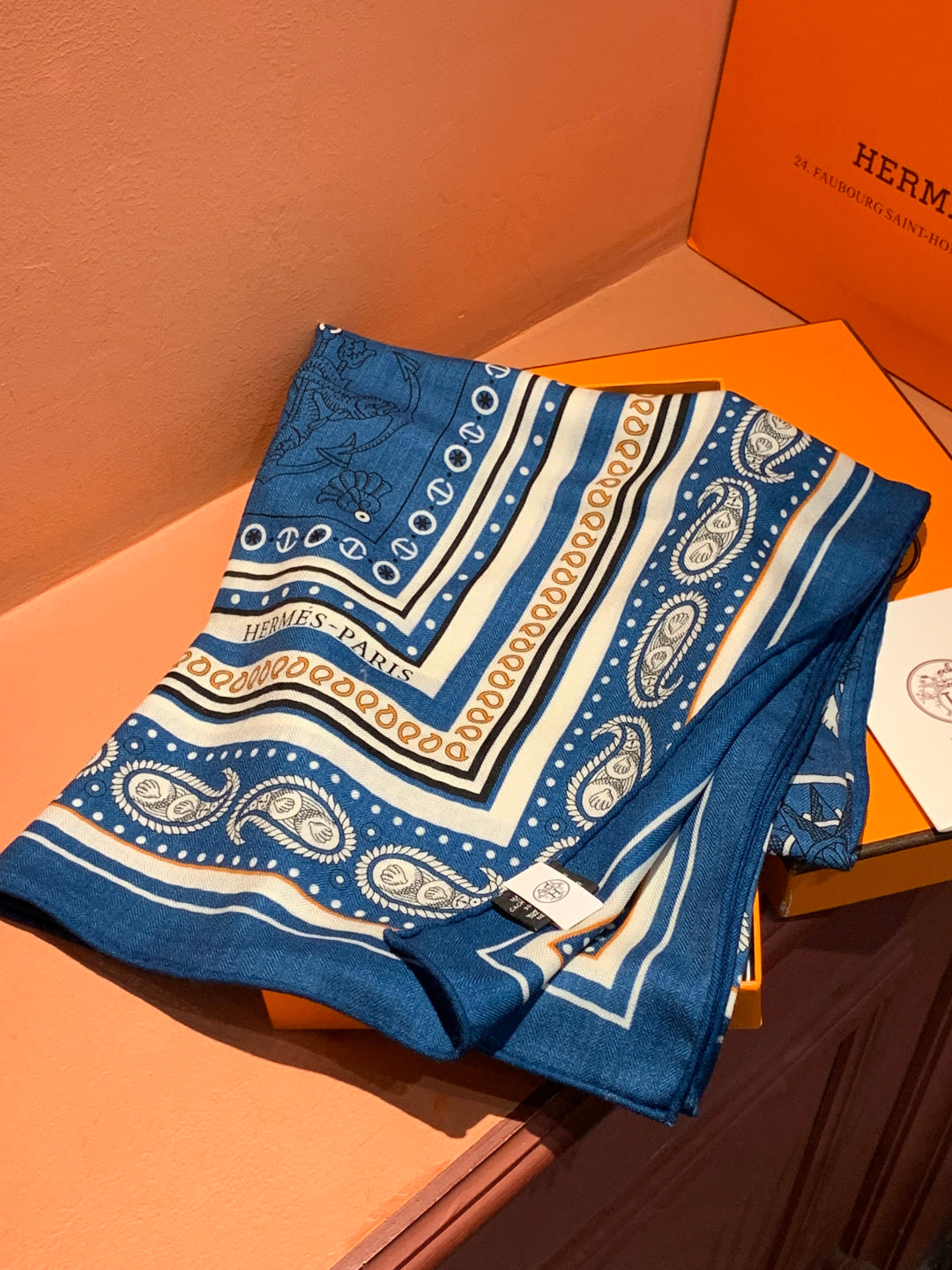 HM 25s Sailor Tattoo Scarf 140cm Dark Blue Beige Cashmere Silk 967415