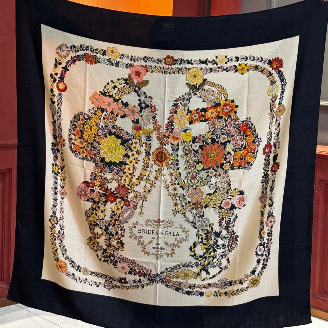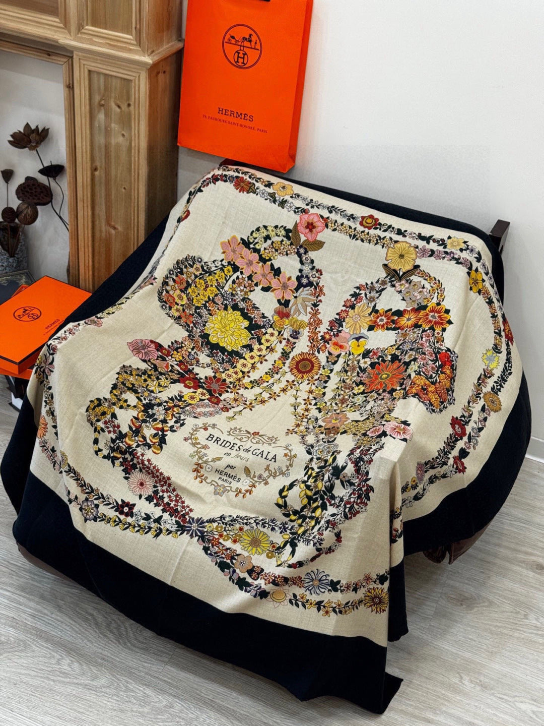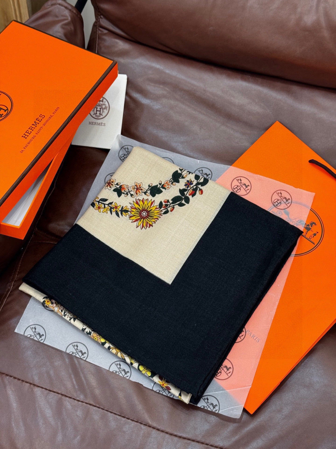 HM 25s Velvet Square Scarf 140cm Black Beige Cashmere 976215