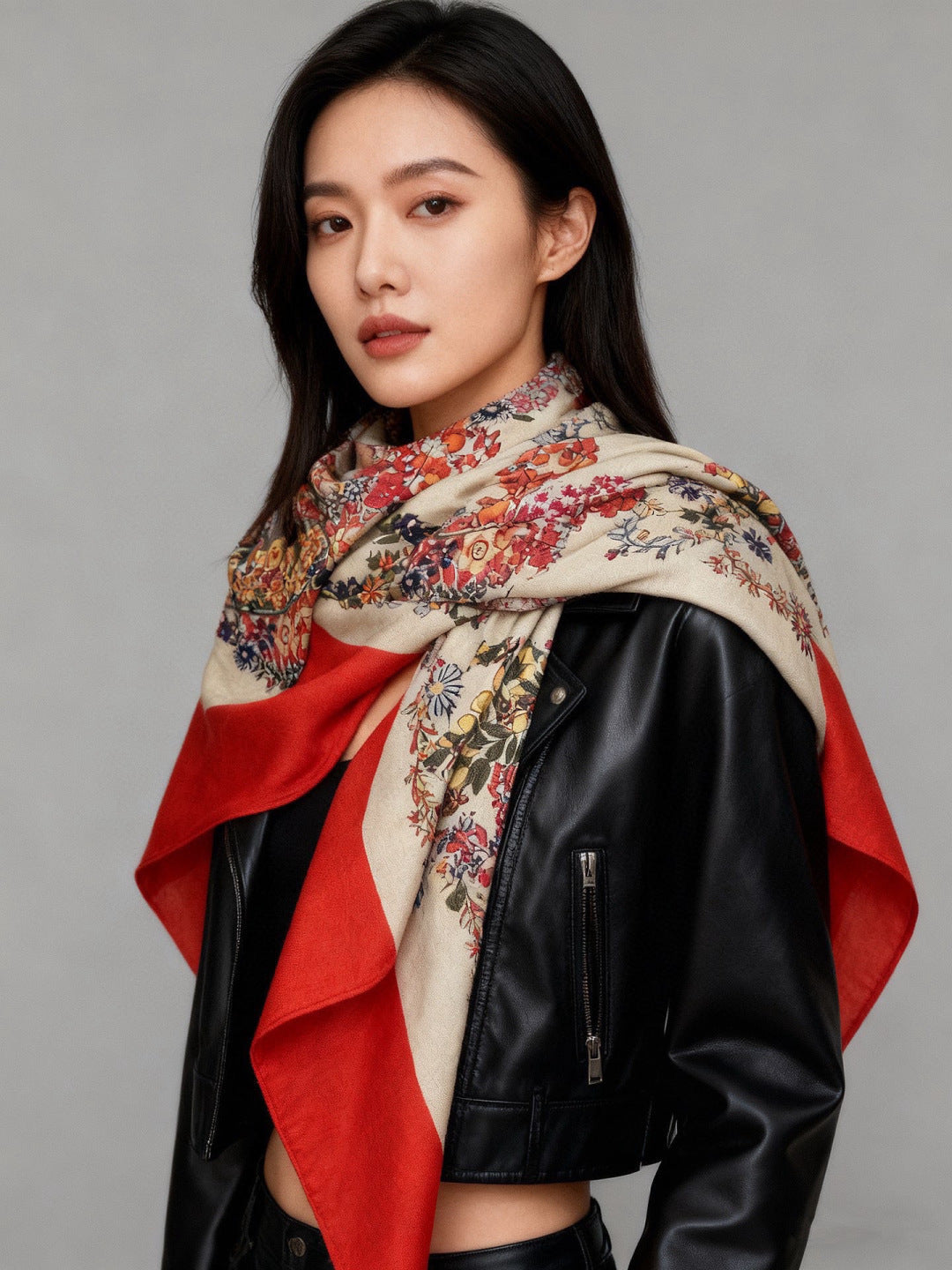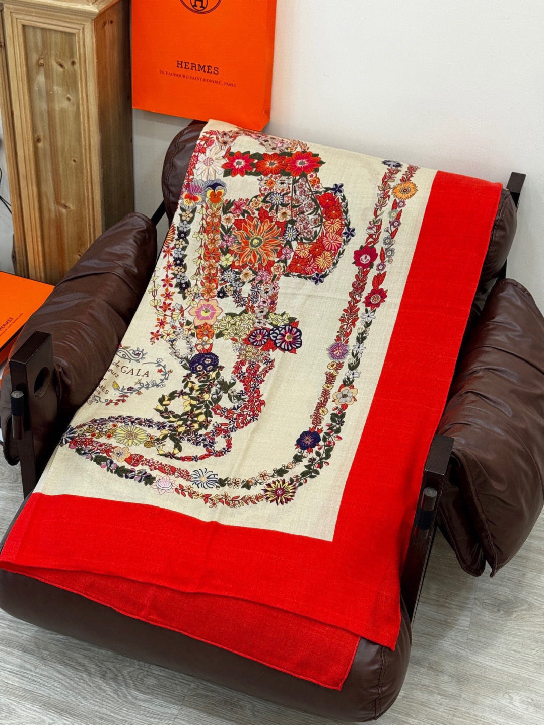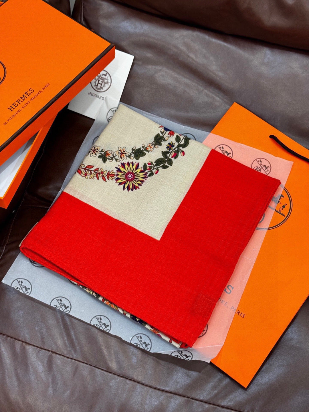 HM 25s Velvet Square Scarf 140cm Light Beige Red Cashmere 976213