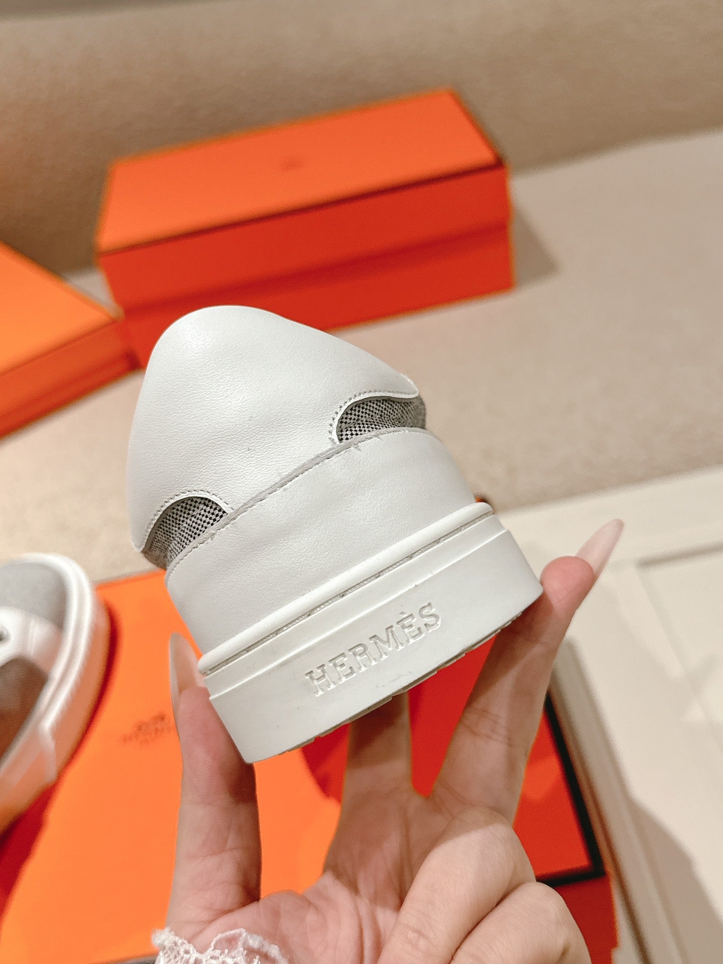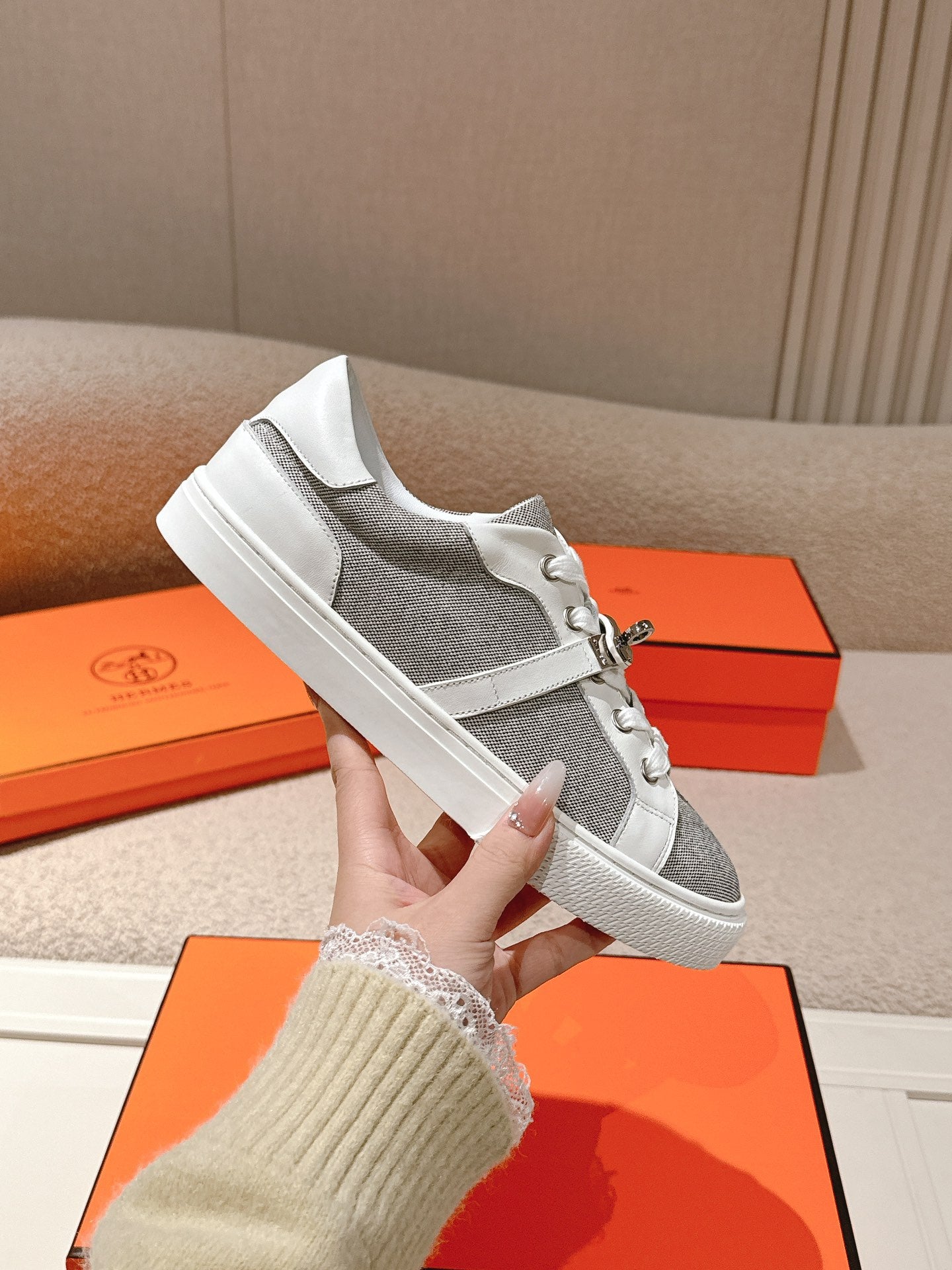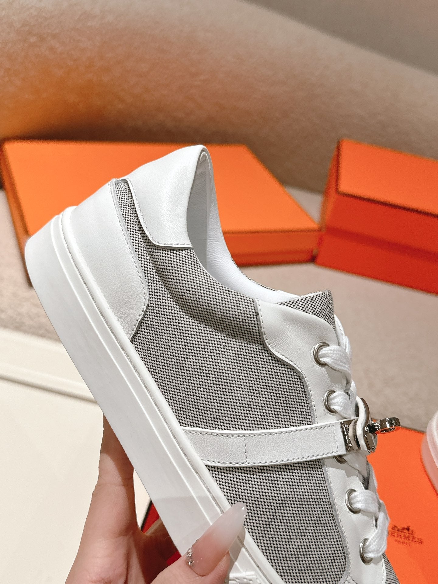 HM 25ss Kelly Buckle Sneakers White Gray Cowhide Canvas 577491