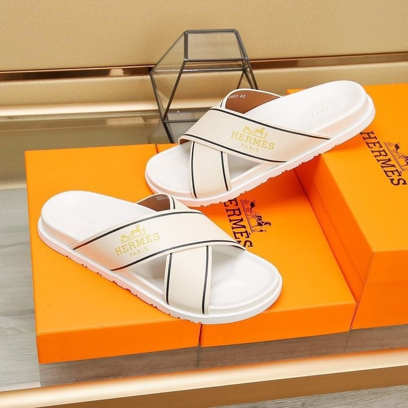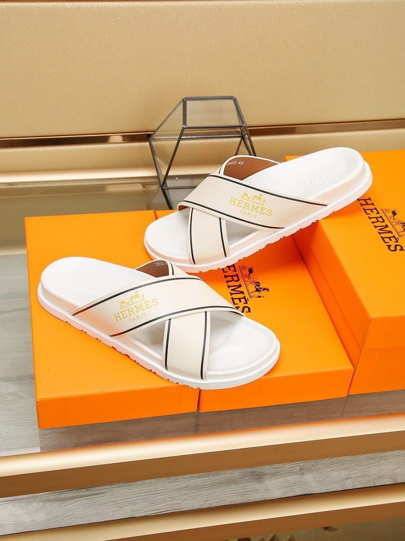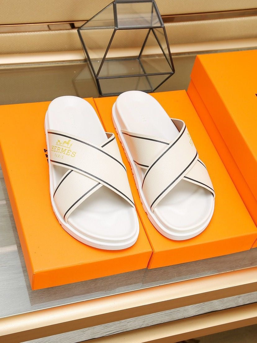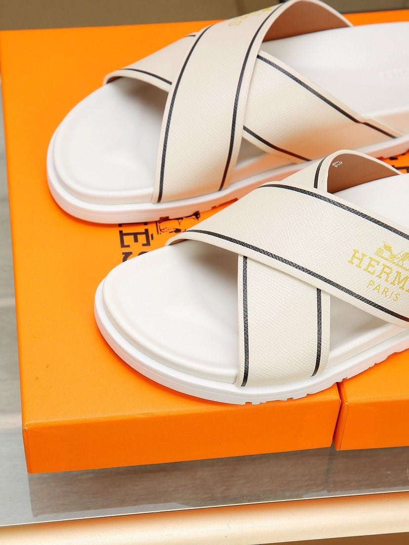 HM Men's Cross Strap Slide Beige Cowhide 544097