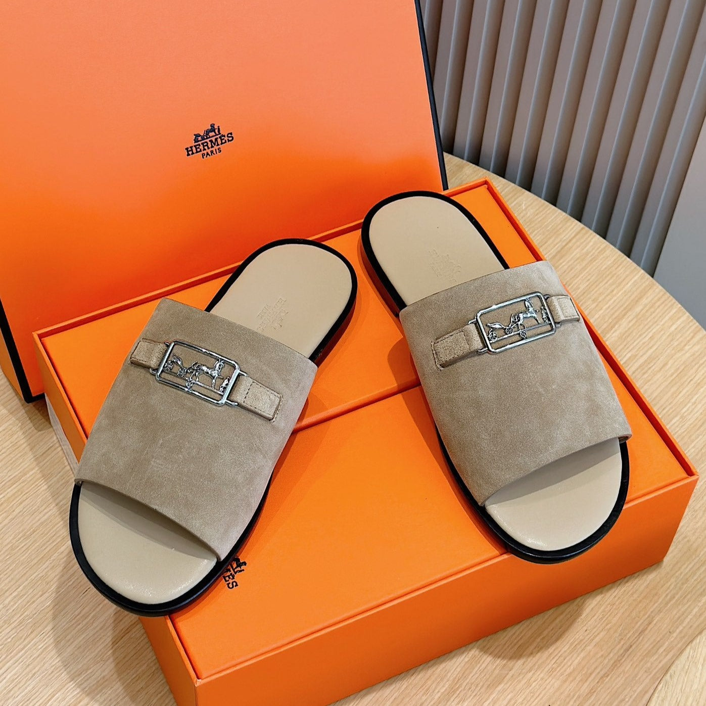 HM SILVER BUCKLE SLIPPERS LIGHT BROWN SUEDE