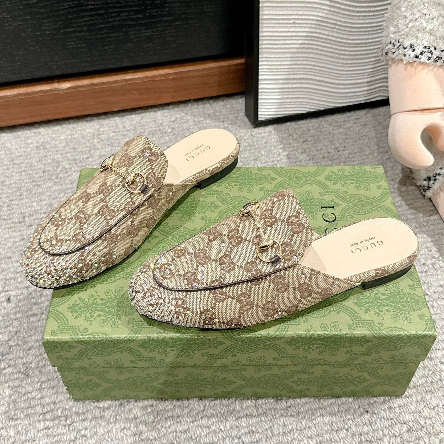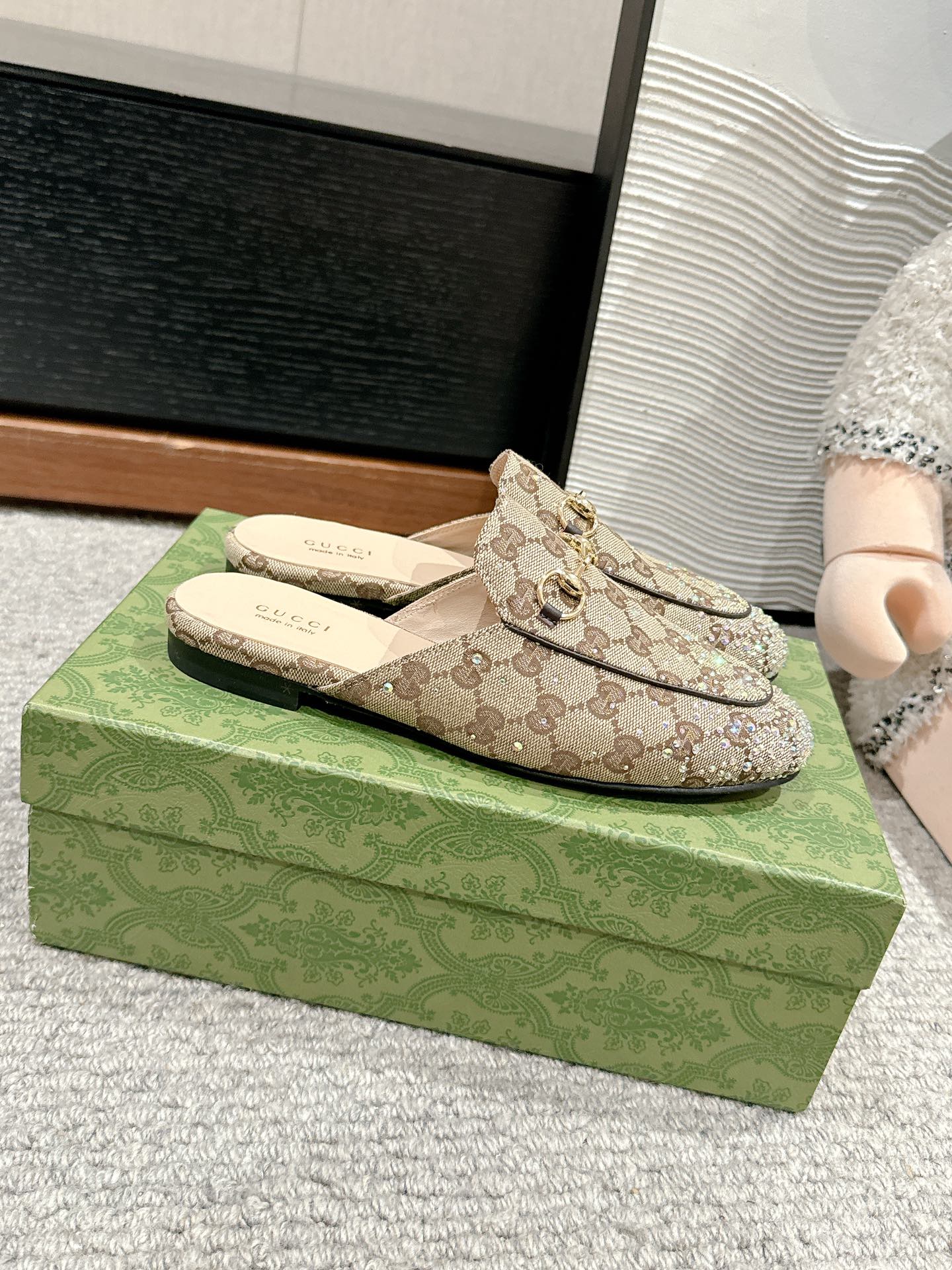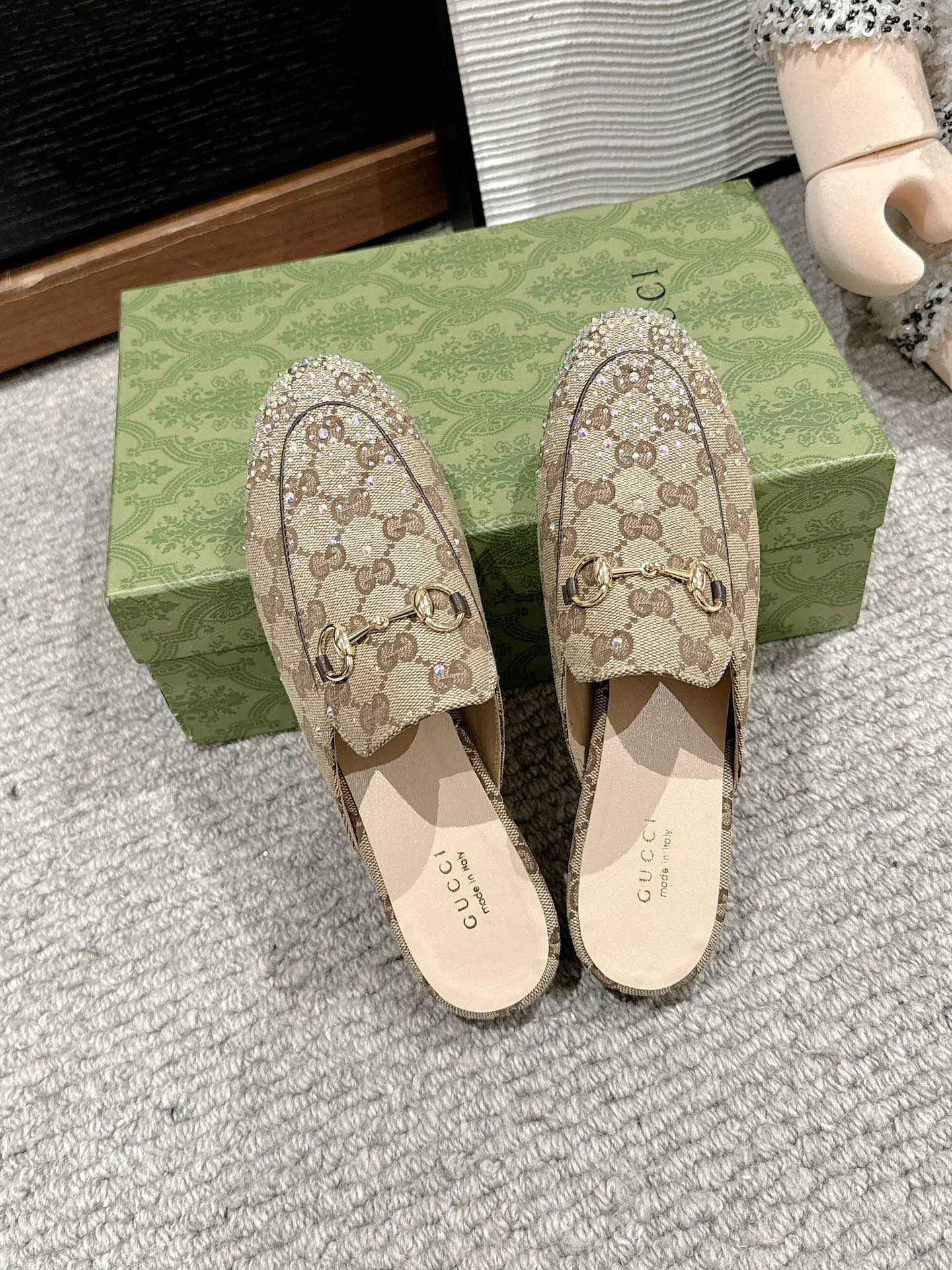 Horsebit Mule Beige Ebony Canvas Crystal-Embellished