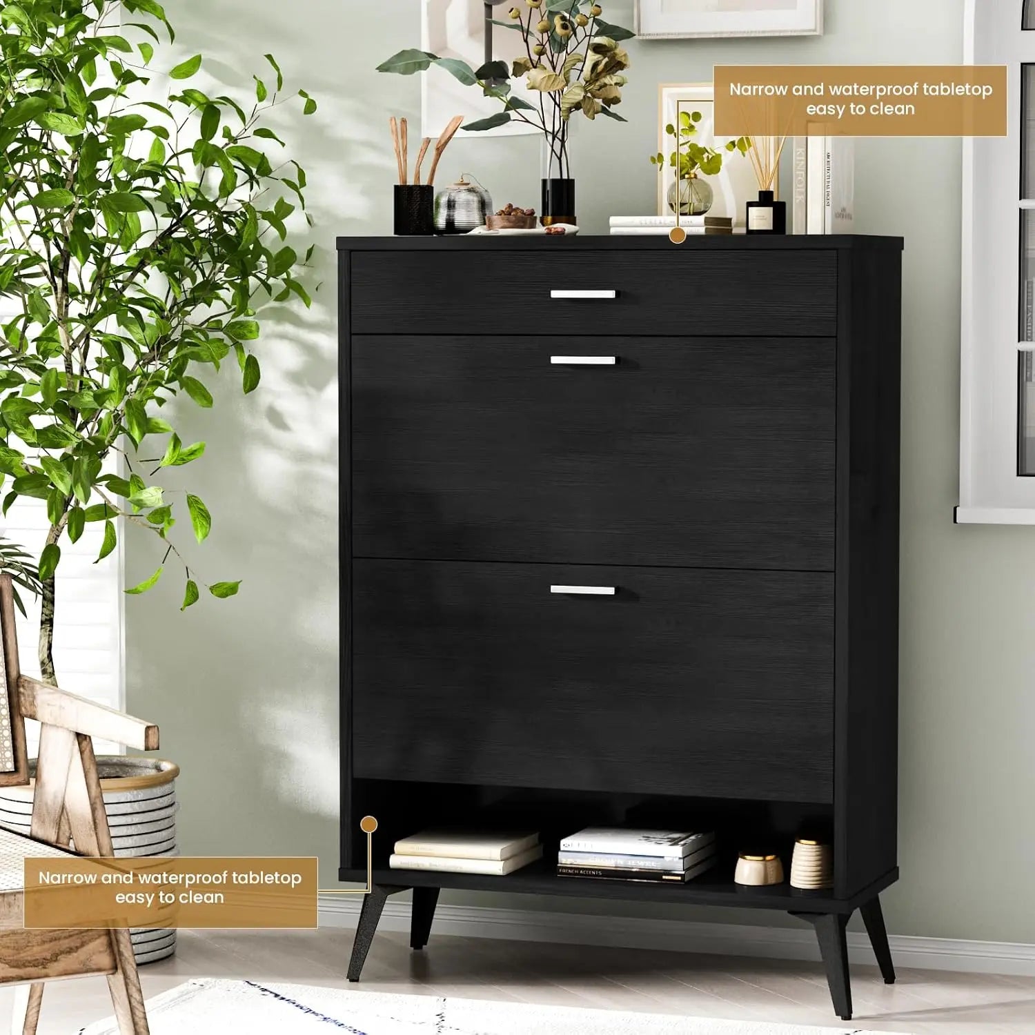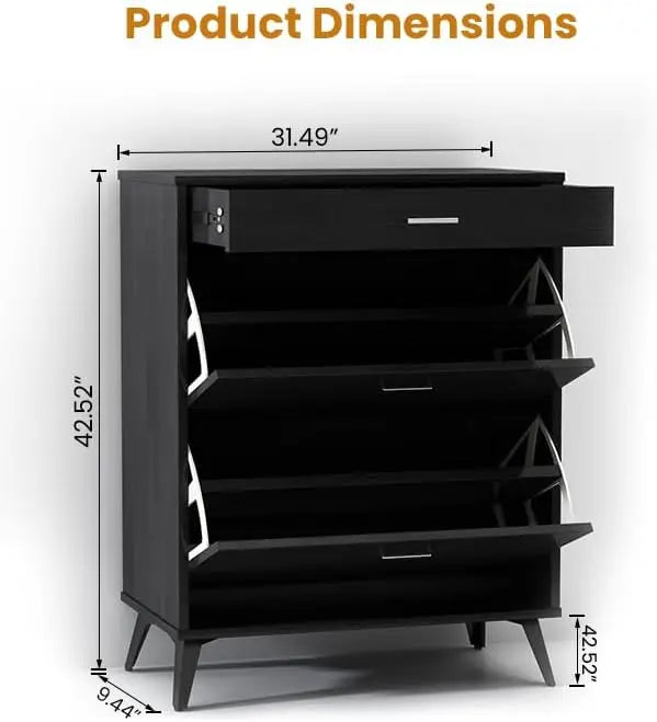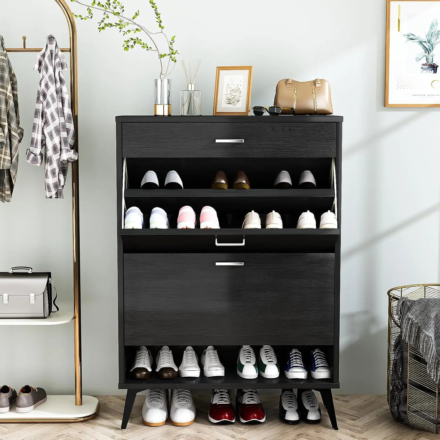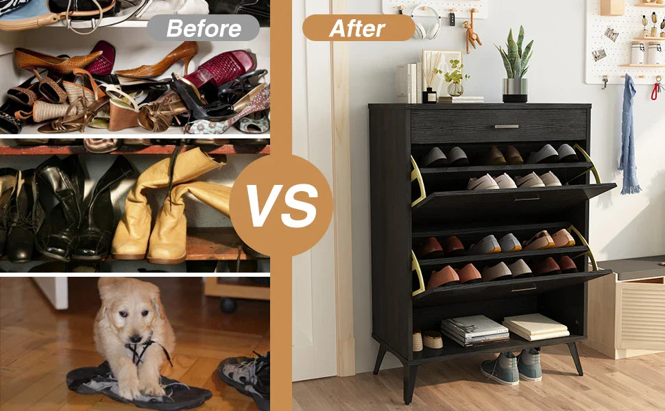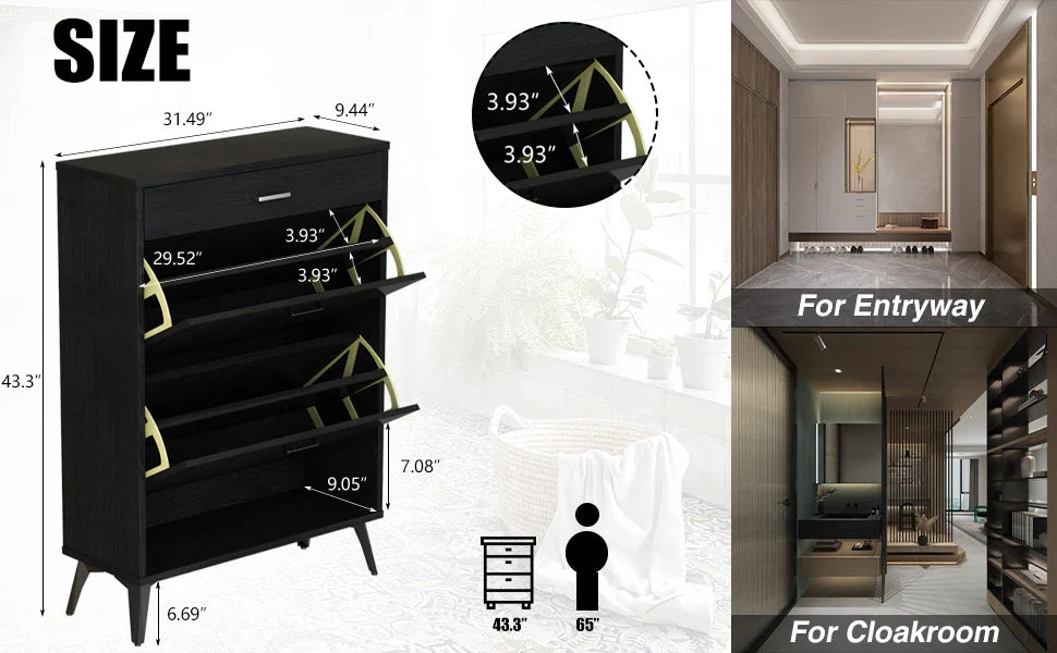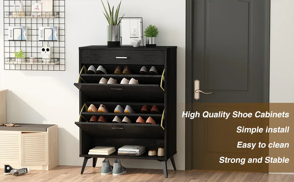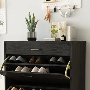 Featuring two hidden flip drawers with adjustable layers, this cabinet is perfect for organizing 14–16 pairs of shoes. Plus, the top drawer and bottom shelf provide extra space for daily essentials.