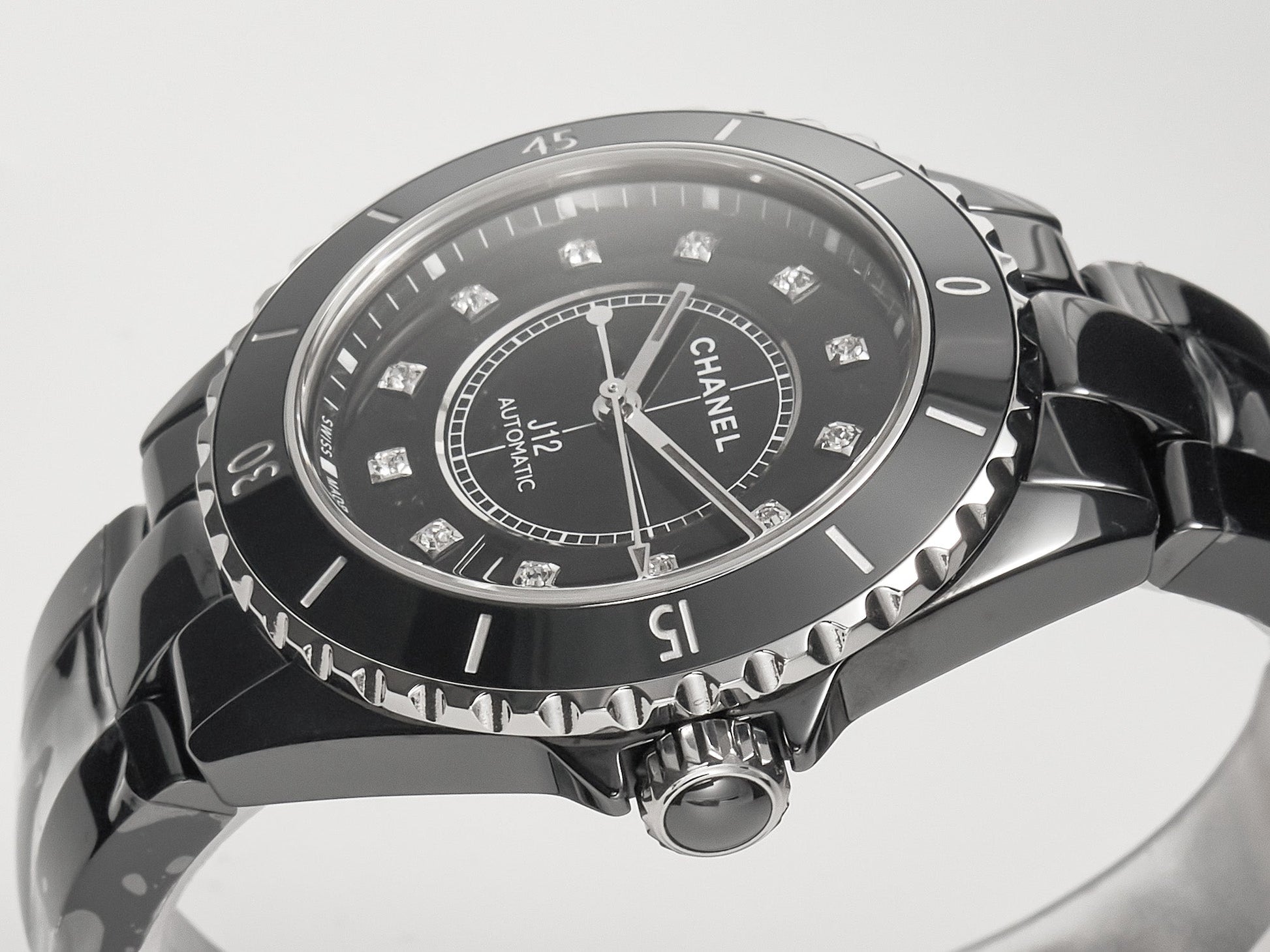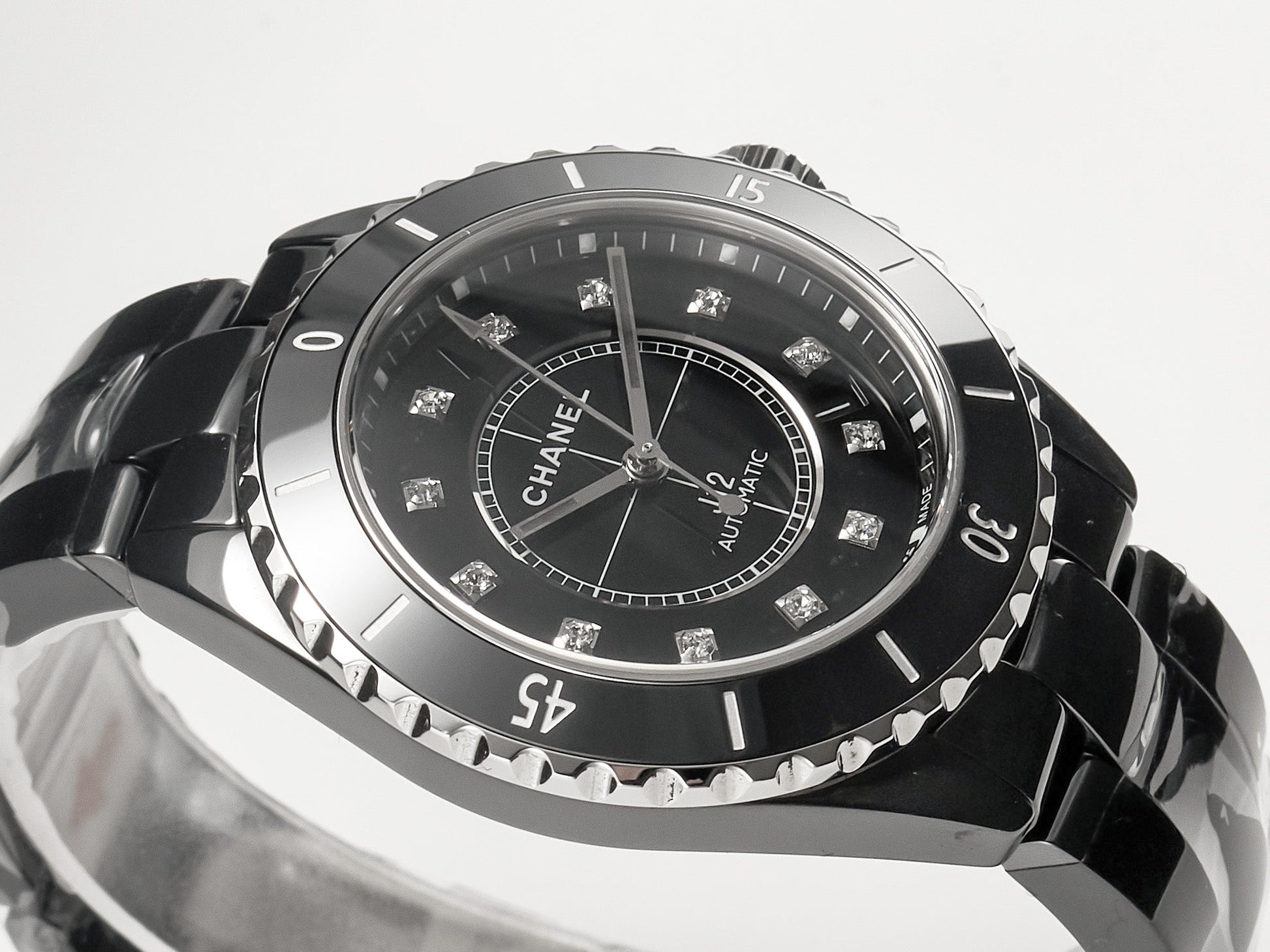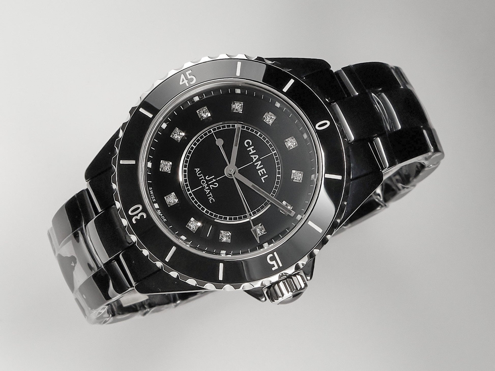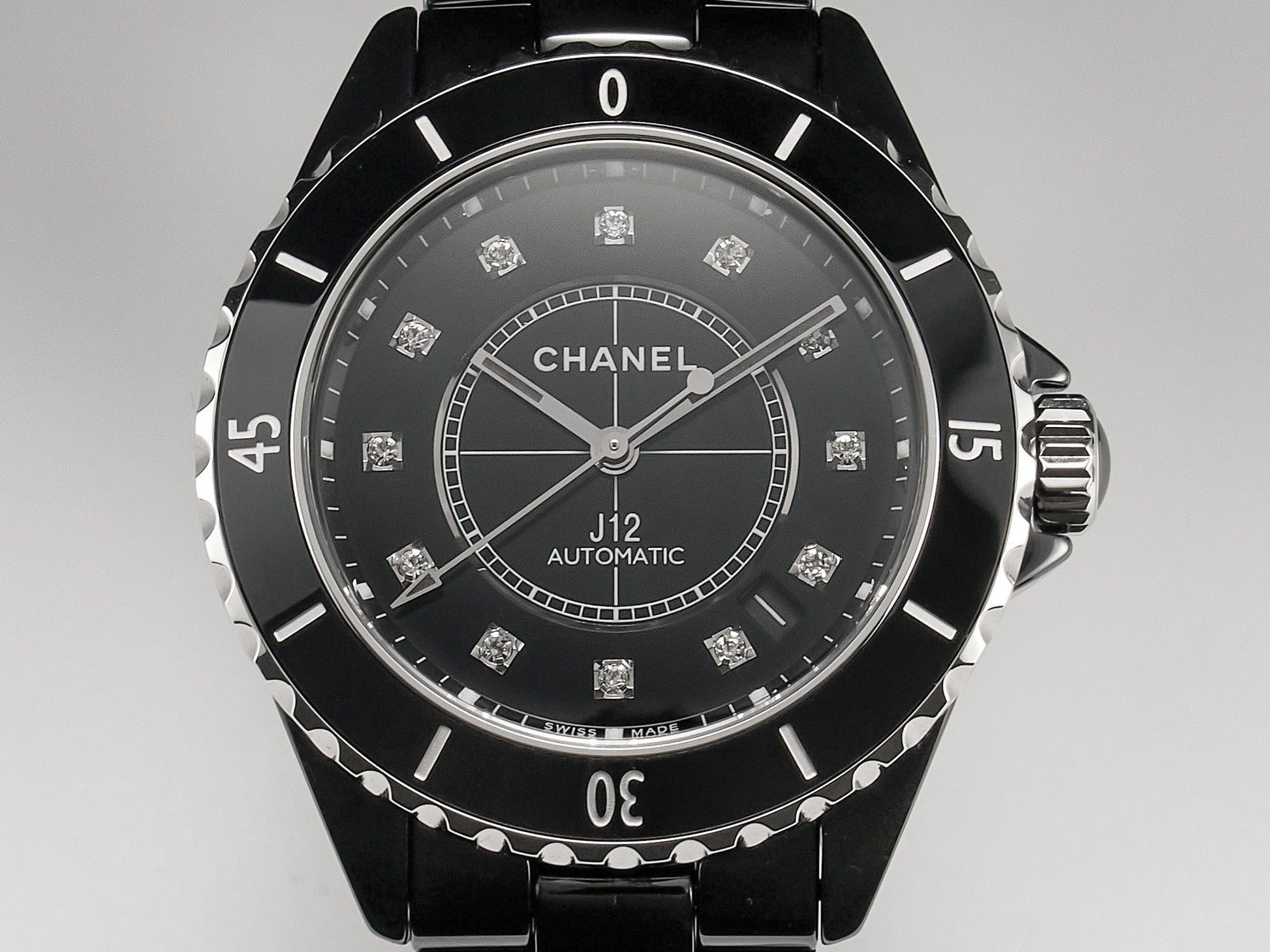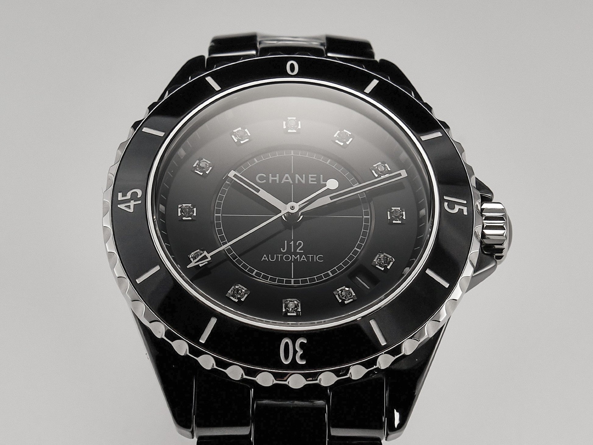 J12 Date Automatic Black Ceramic Diamond Numerals Black Dial Black Steel Hands