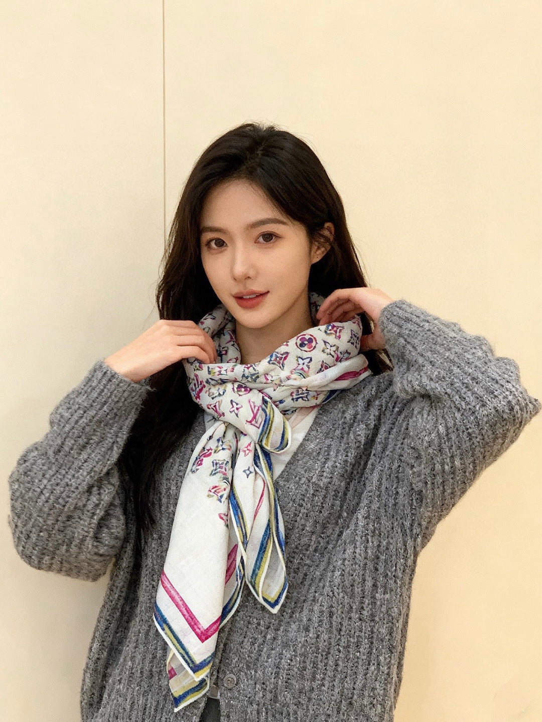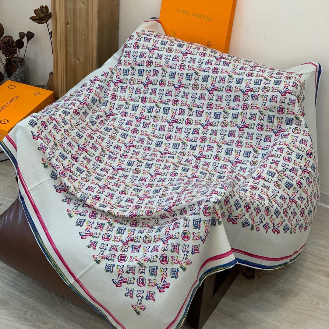 LV Double-Sided Shawl Scarf 135cm Ivory Pink Cashmere 968792