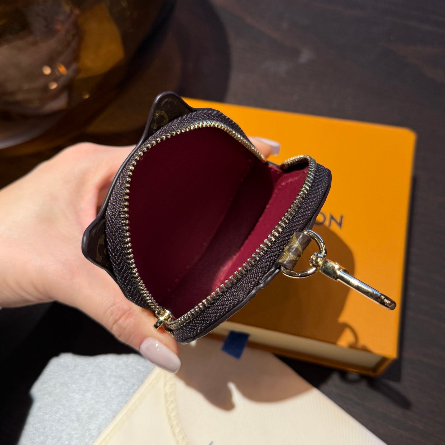 LV Monogram Kitty Coin Purse Charm White Brown Leather Canvas