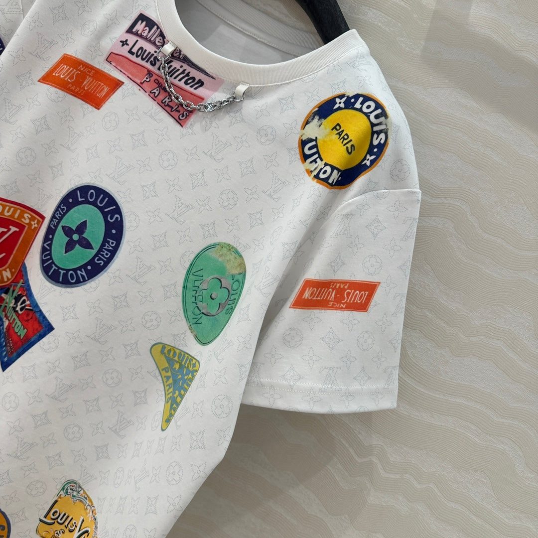 LV Pattern Logo Positioning Poster Badge Printed T-shirt White Cotton