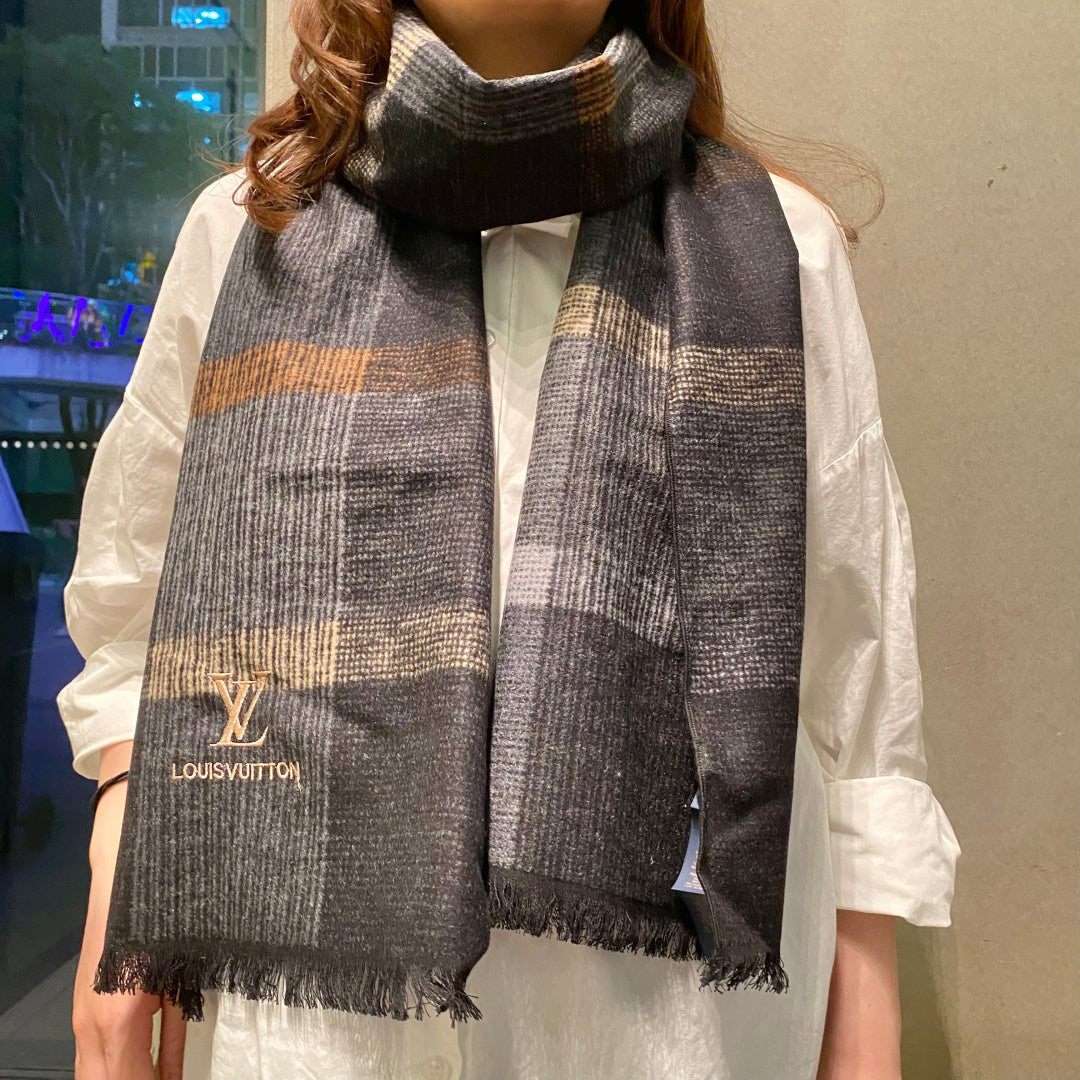 LV Scarf 180cm Black Gray Wool Cashmere 976830